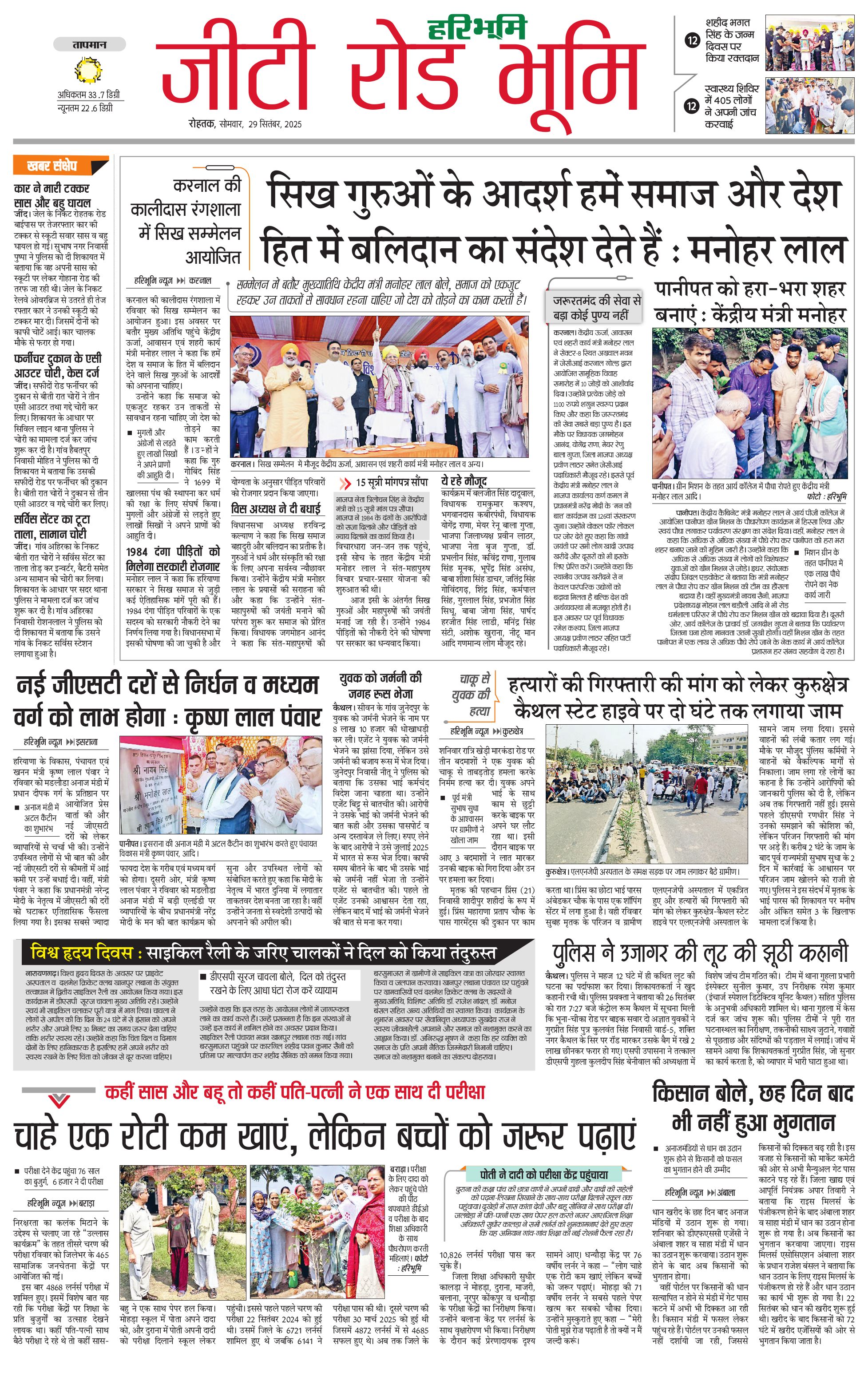 कुरुक्षेत्र - 29 Sep 2025 - - Page 1