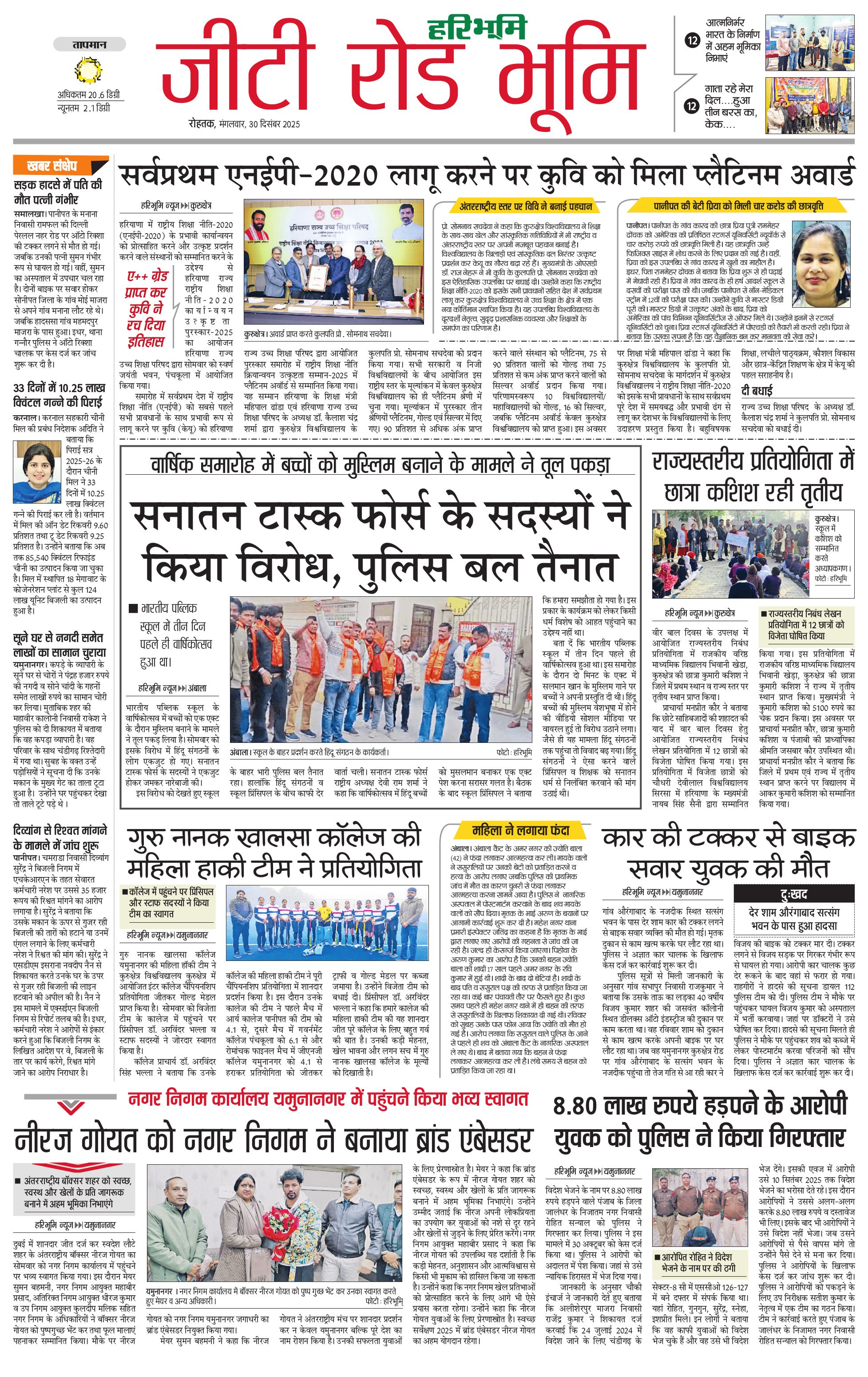 कुरुक्षेत्र - 30 Dec 2025 - - Page 1