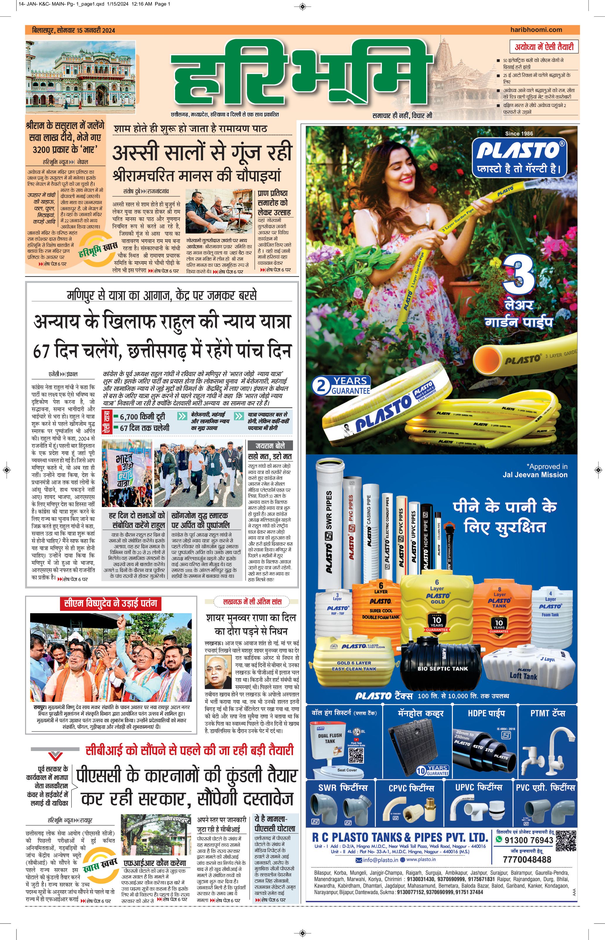बिलासपुर मुख्य संस्करण - 15 Jan 2024 - - Page 1