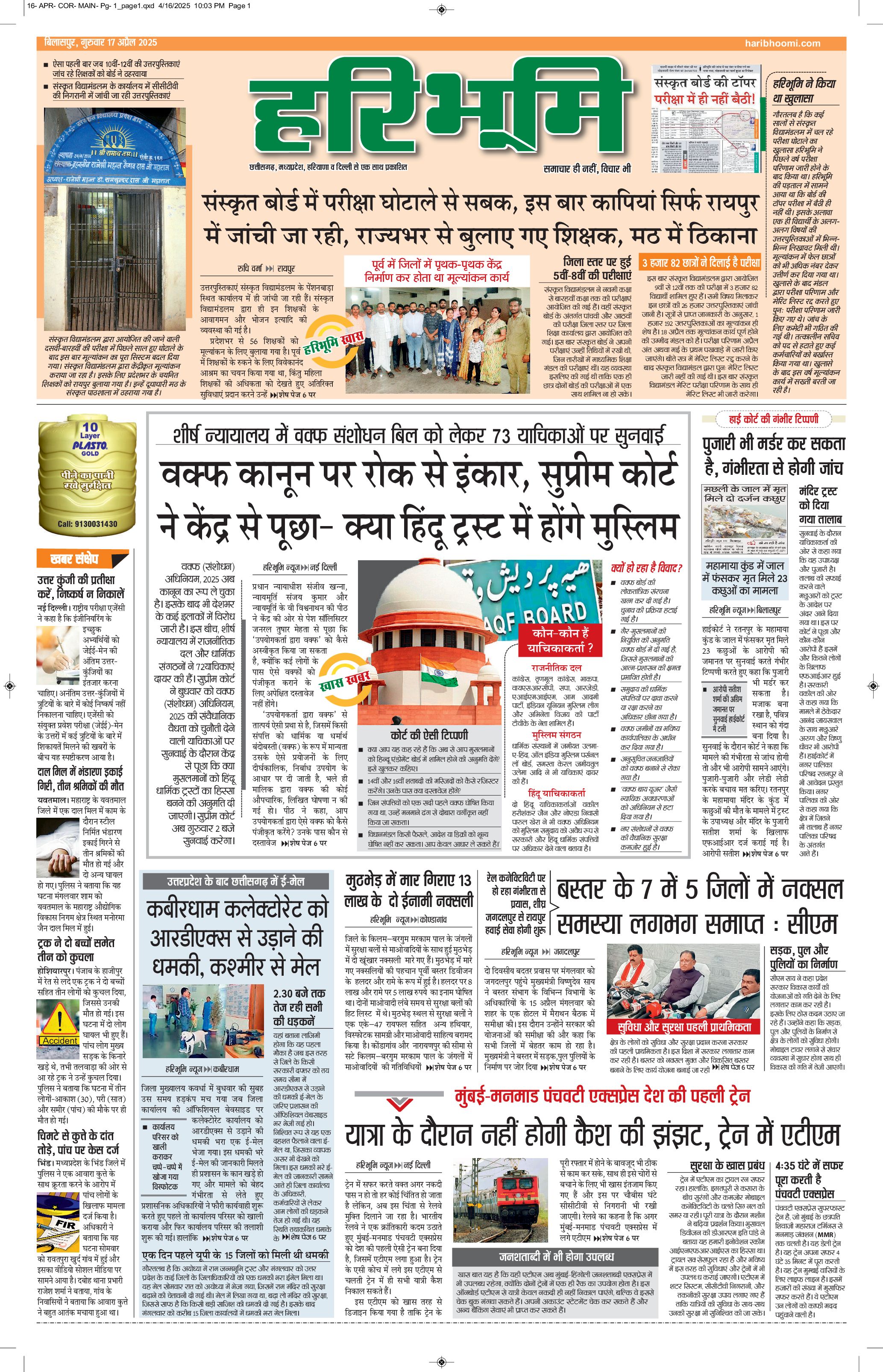 बिलासपुर मुख्य संस्करण - 17 Apr 2025 - - Page 1