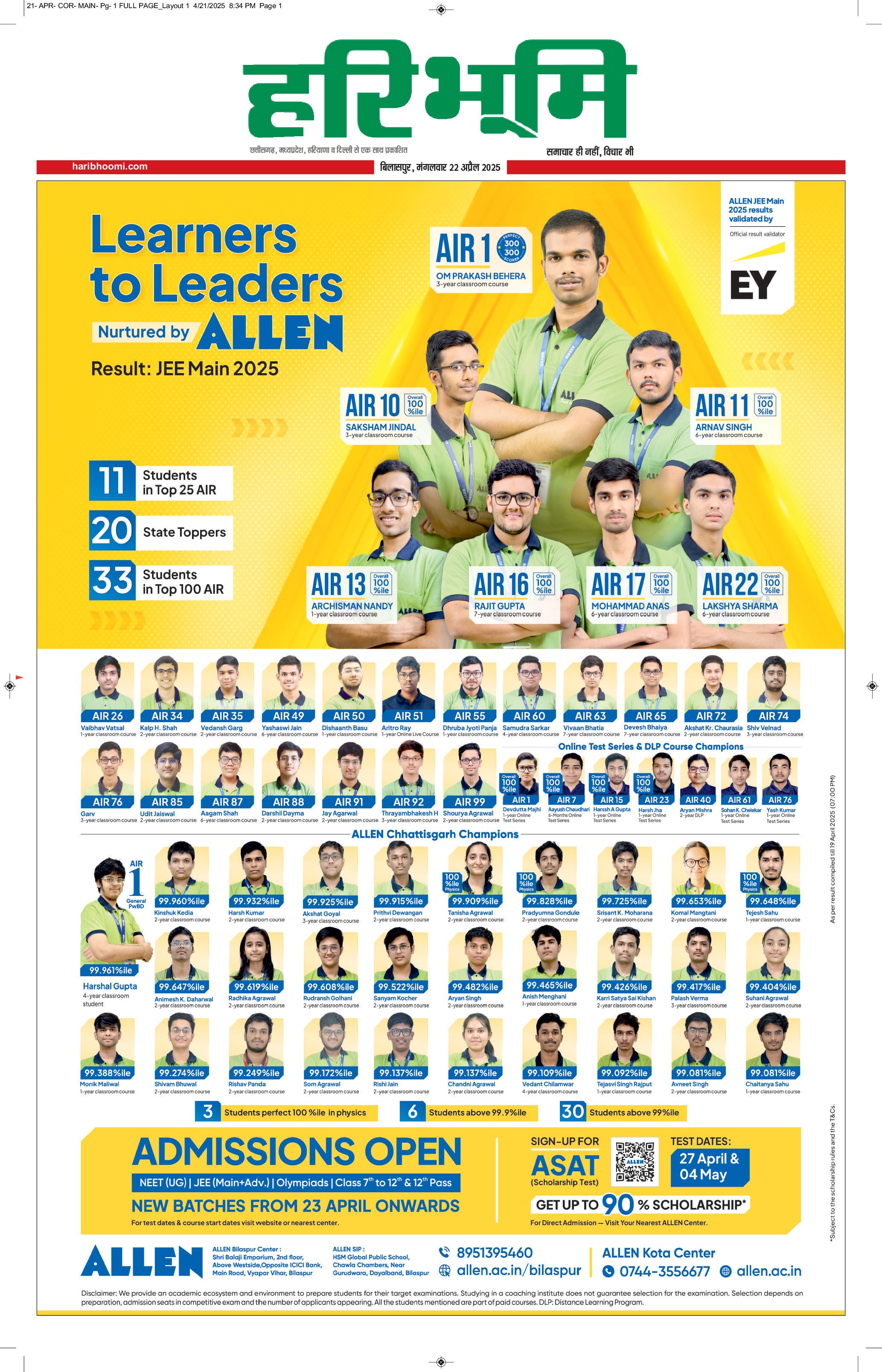बिलासपुर मुख्य संस्करण - 22 Apr 2025 - - Page 1