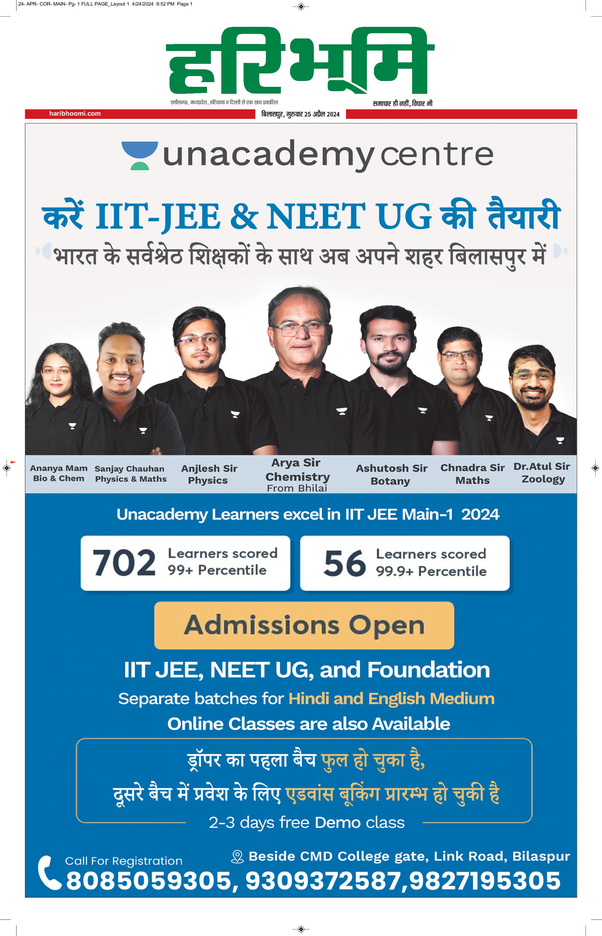 बिलासपुर मुख्य संस्करण - 25 Apr 2024 - - Page 1