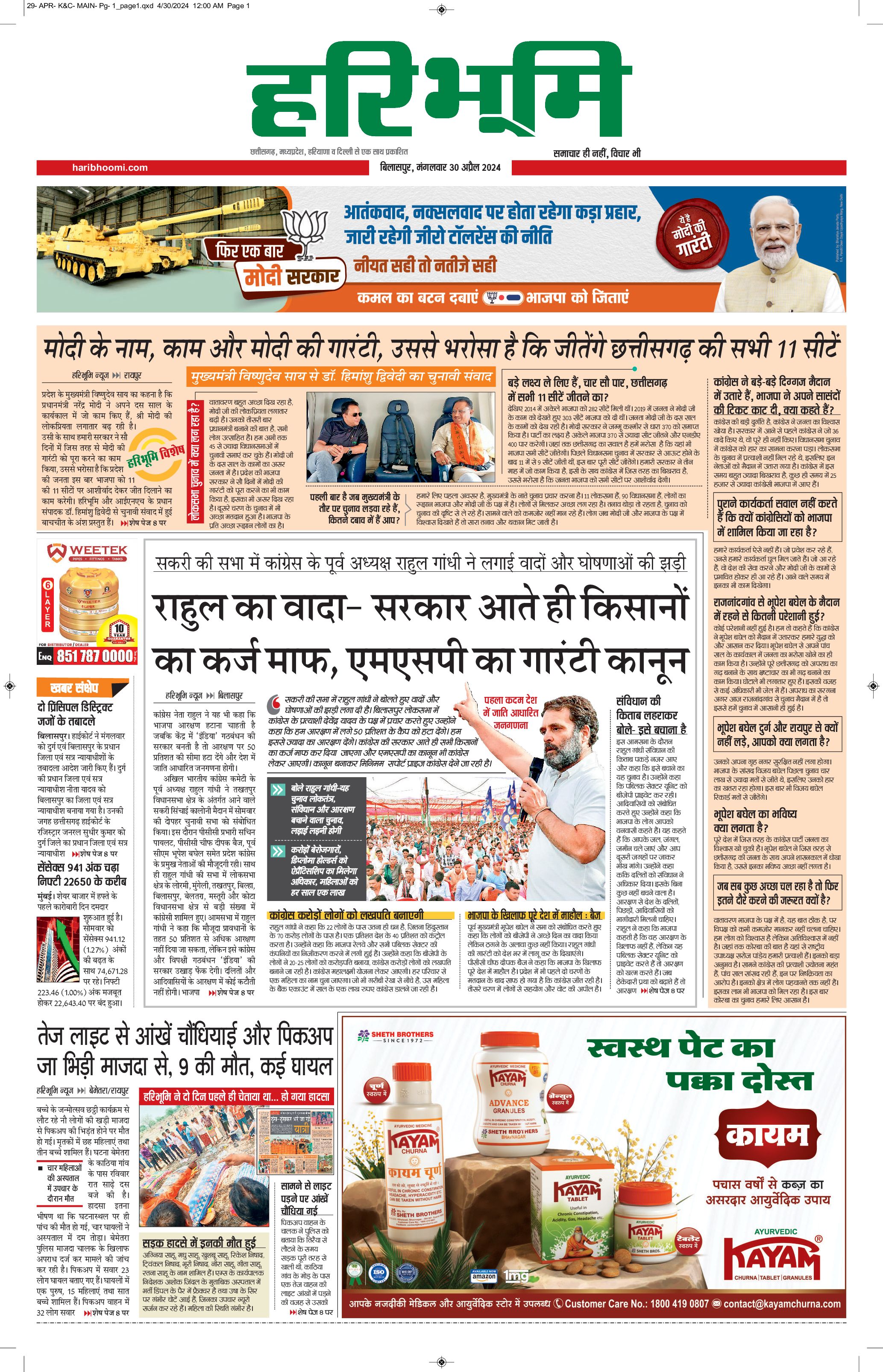 बिलासपुर मुख्य संस्करण - 30 Apr 2024 - - Page 1