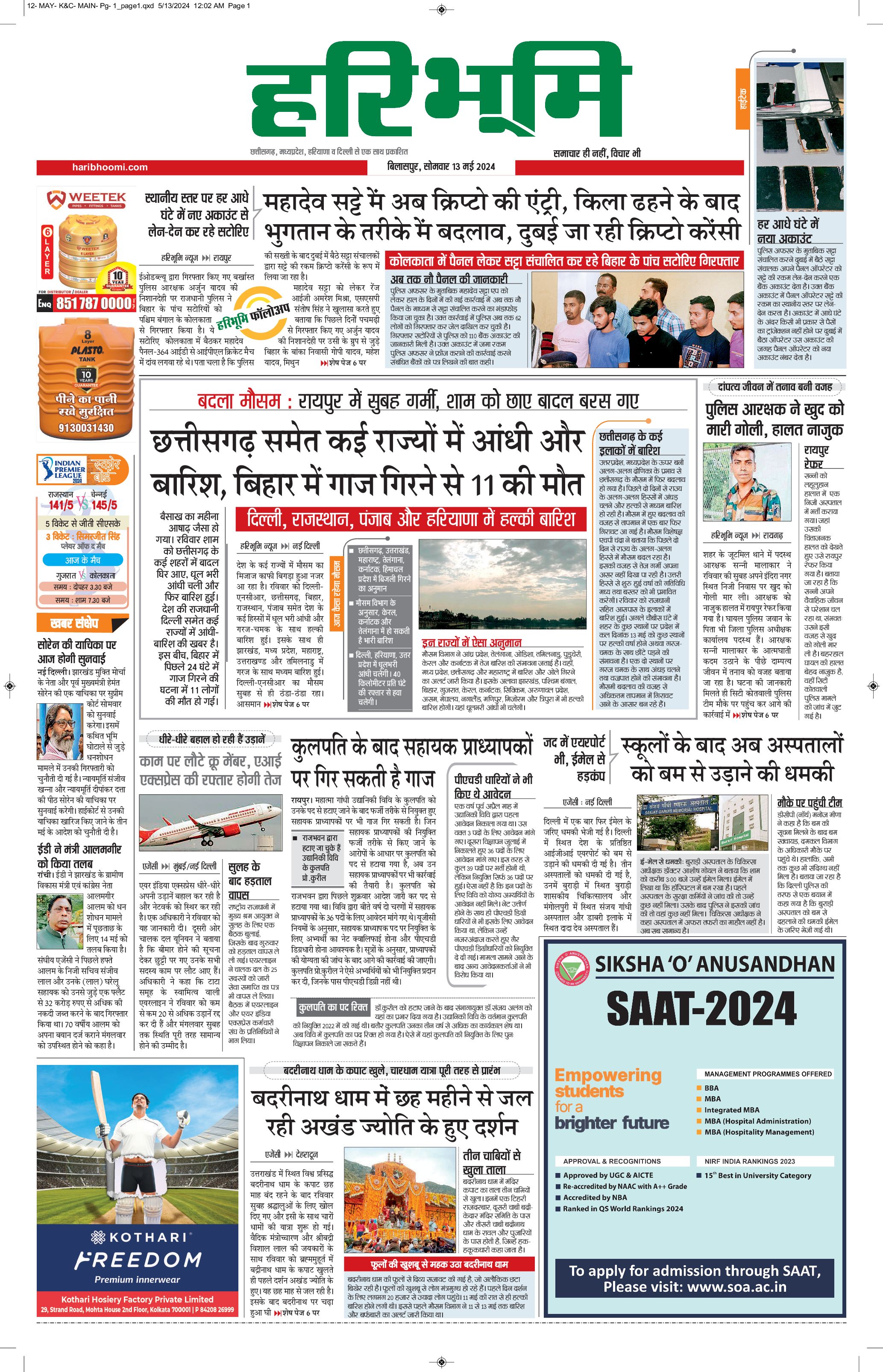 बिलासपुर मुख्य संस्करण - 13 May 2024 - - Page 1