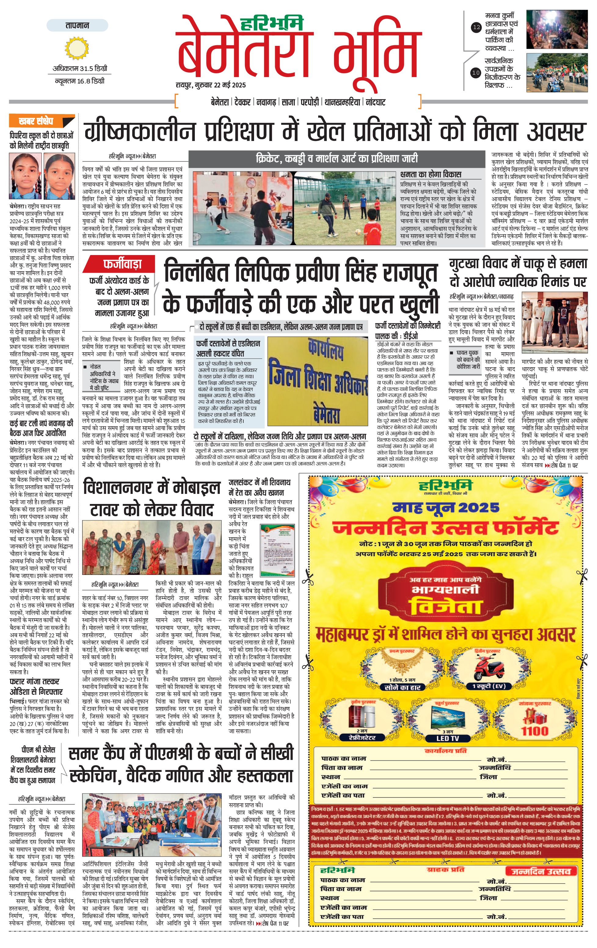 बेमेतरा भूमि - 22 May 2025 - - Page 1