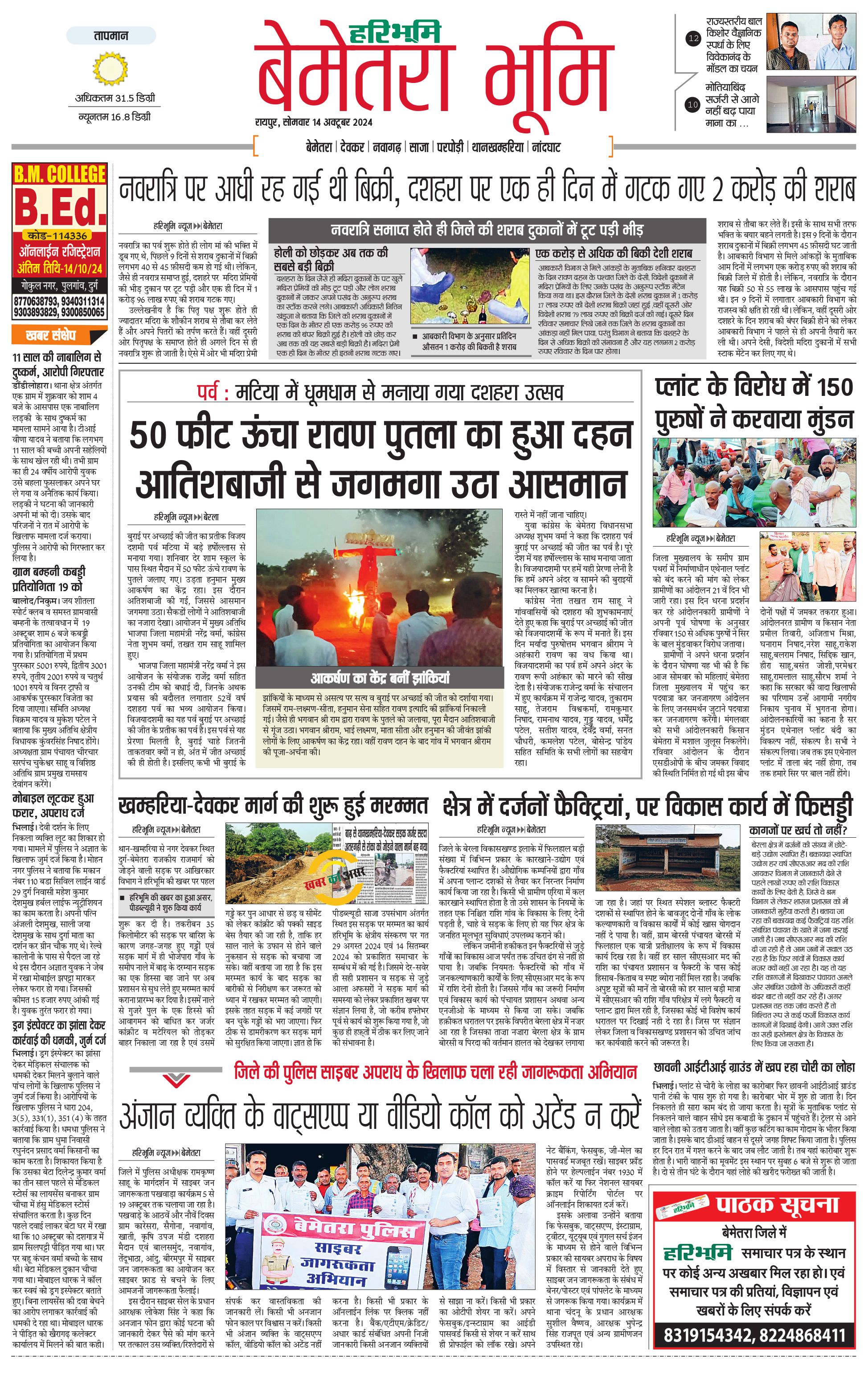 बेमेतरा भूमि - 14 Oct 2024 - - Page 1