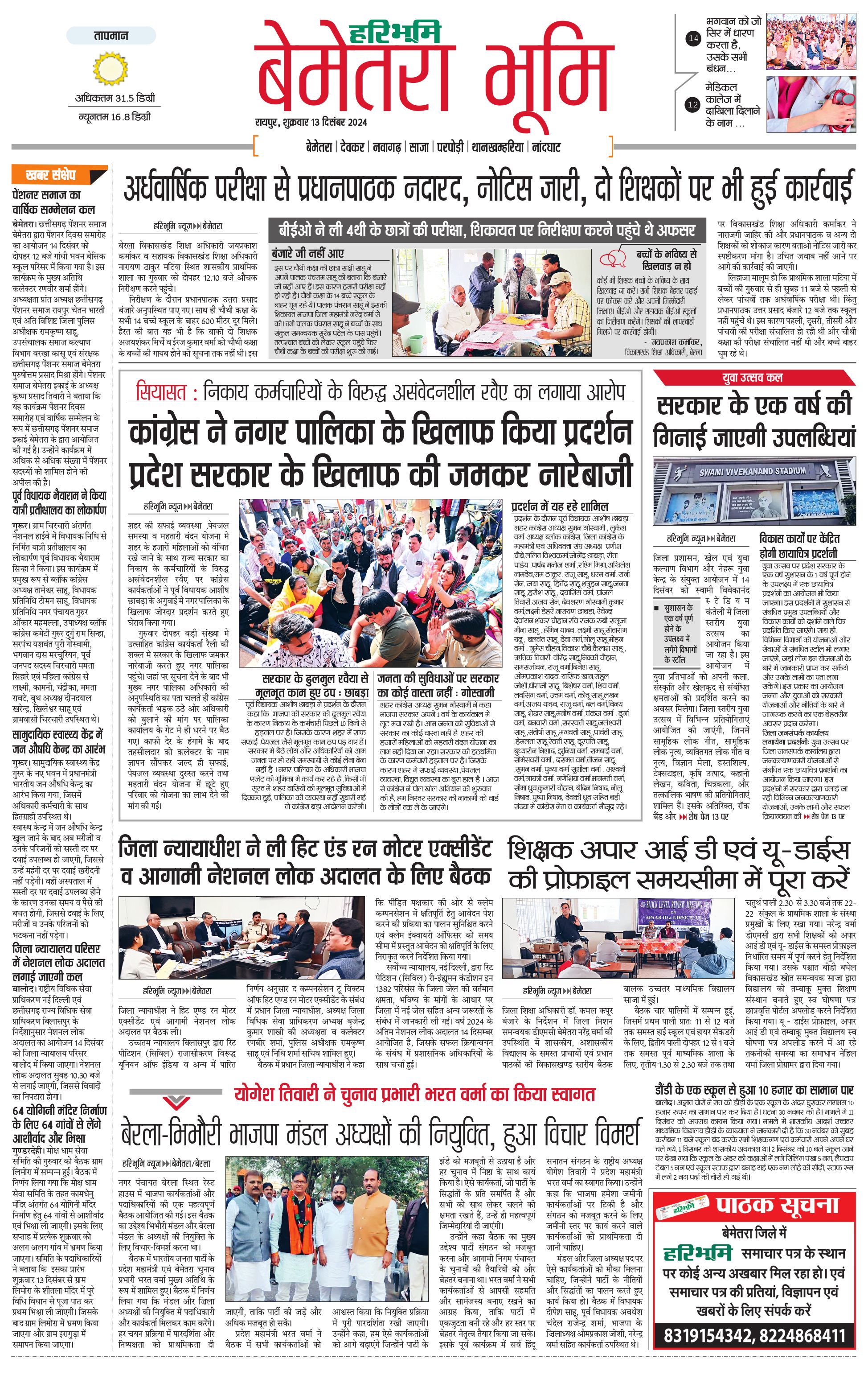 बेमेतरा भूमि - 13 Dec 2024 - - Page 1