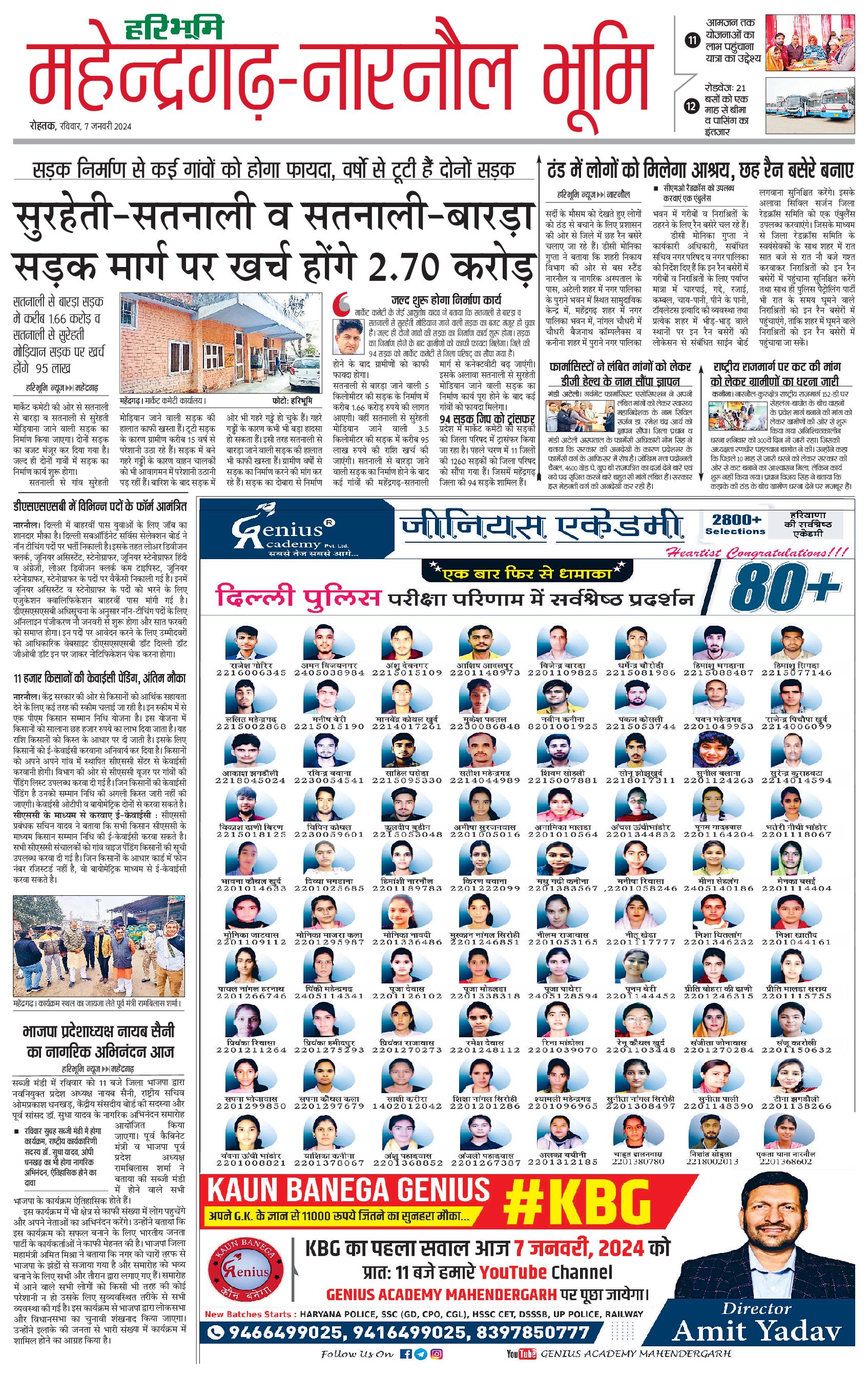 महेंद्रगढ़ - 07 Jan 2024 - - Page 1
