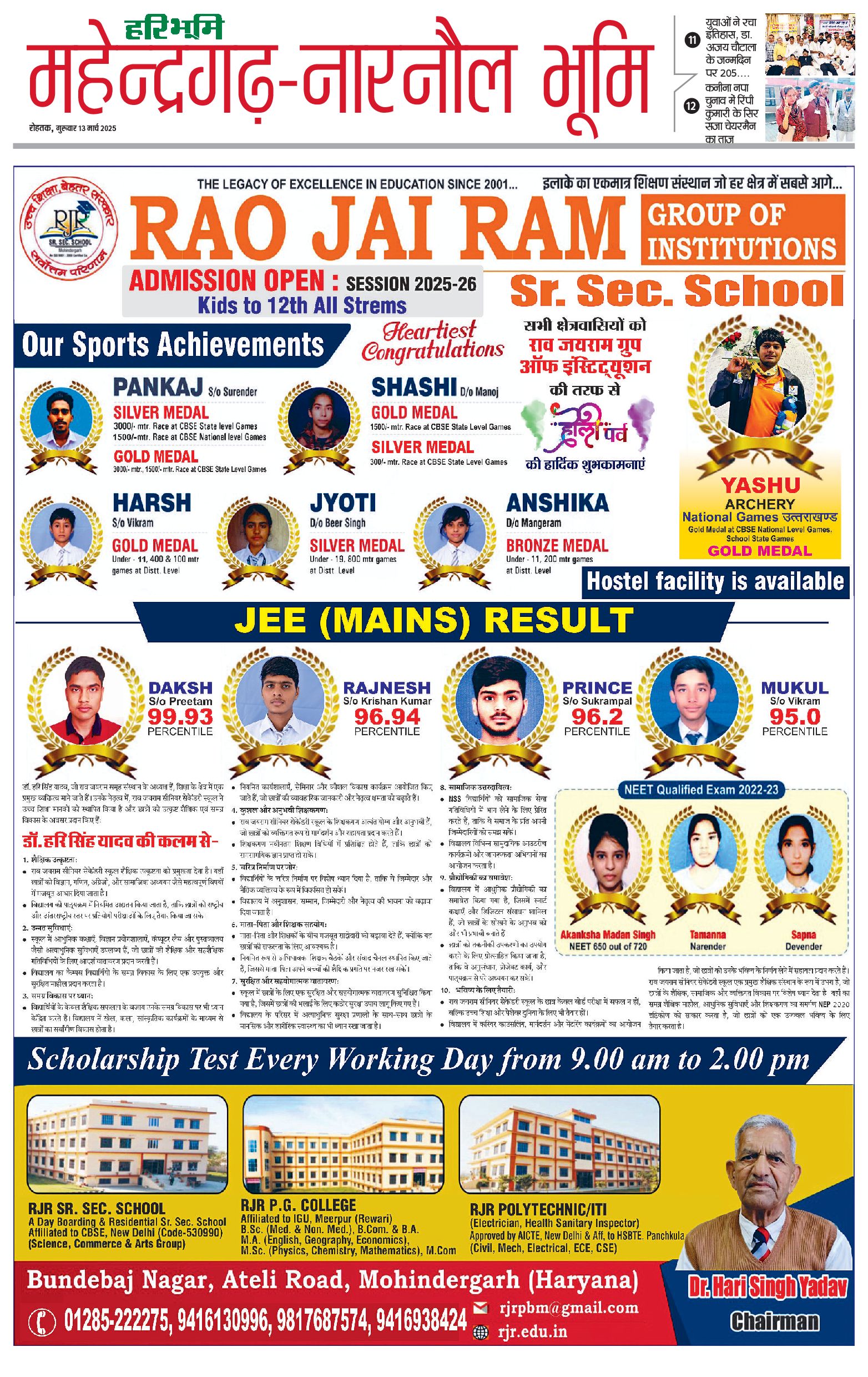 महेंद्रगढ़ - 13 Mar 2025 - - Page 1
