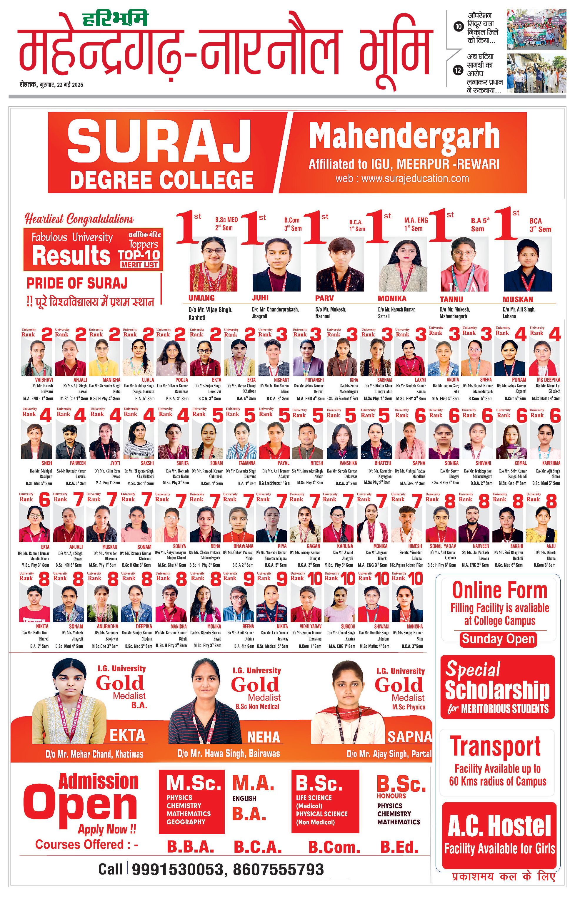 महेंद्रगढ़ - 22 May 2025 - - Page 1