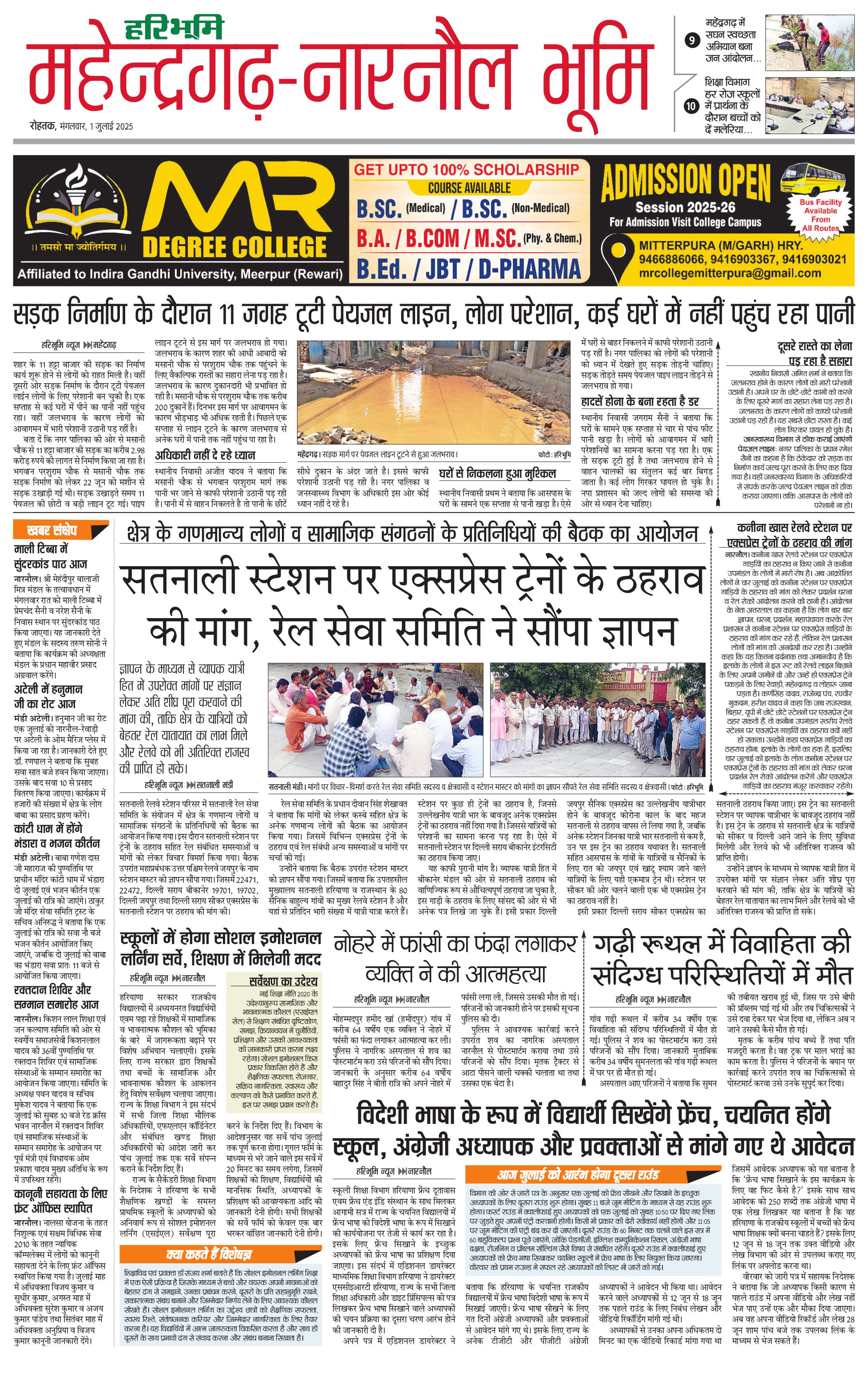महेंद्रगढ़ - 01 Jul 2025 - - Page 1