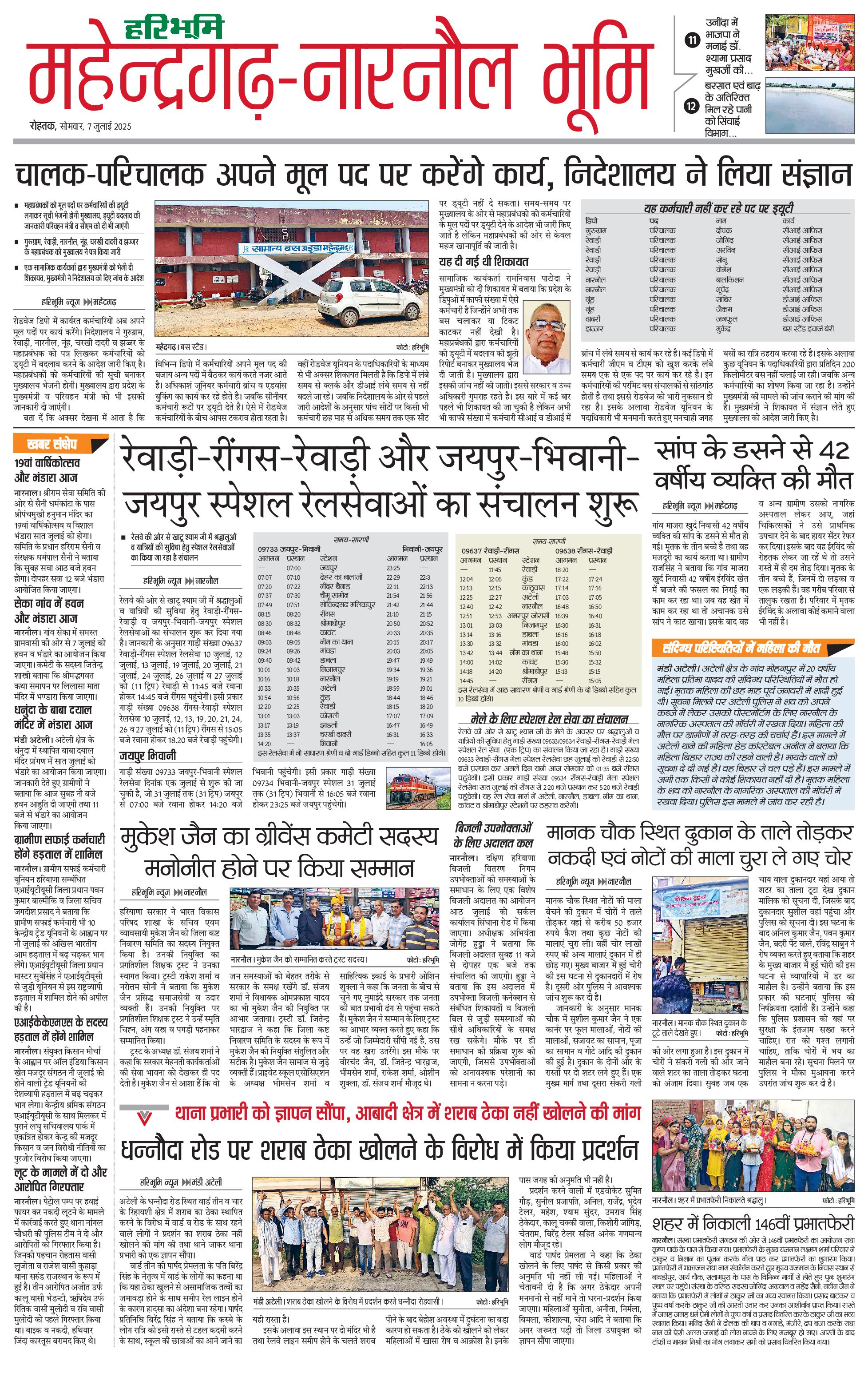 महेंद्रगढ़ - 07 Jul 2025 - - Page 1