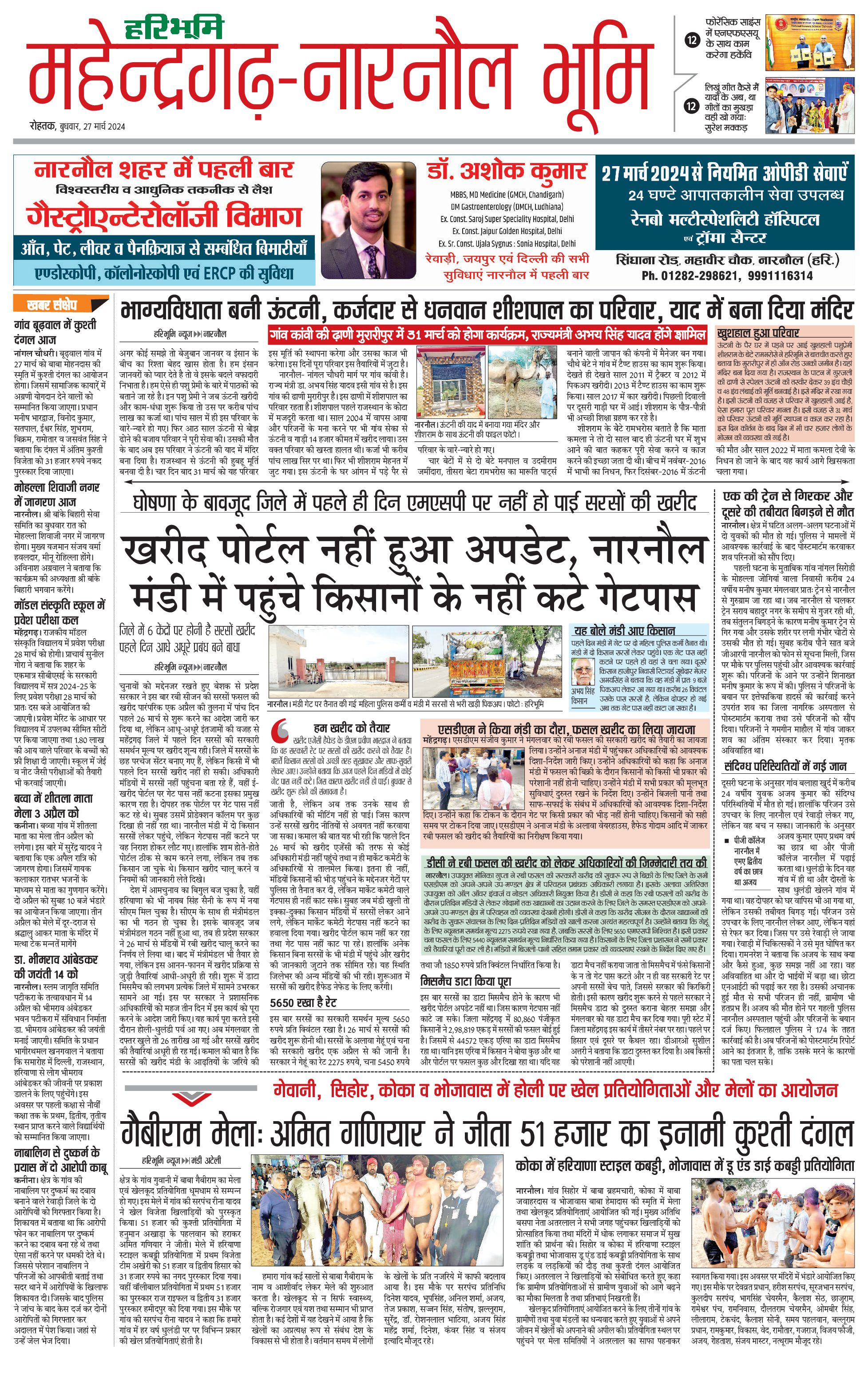 महेंद्रगढ़ - 27 Mar 2024 - - Page 1