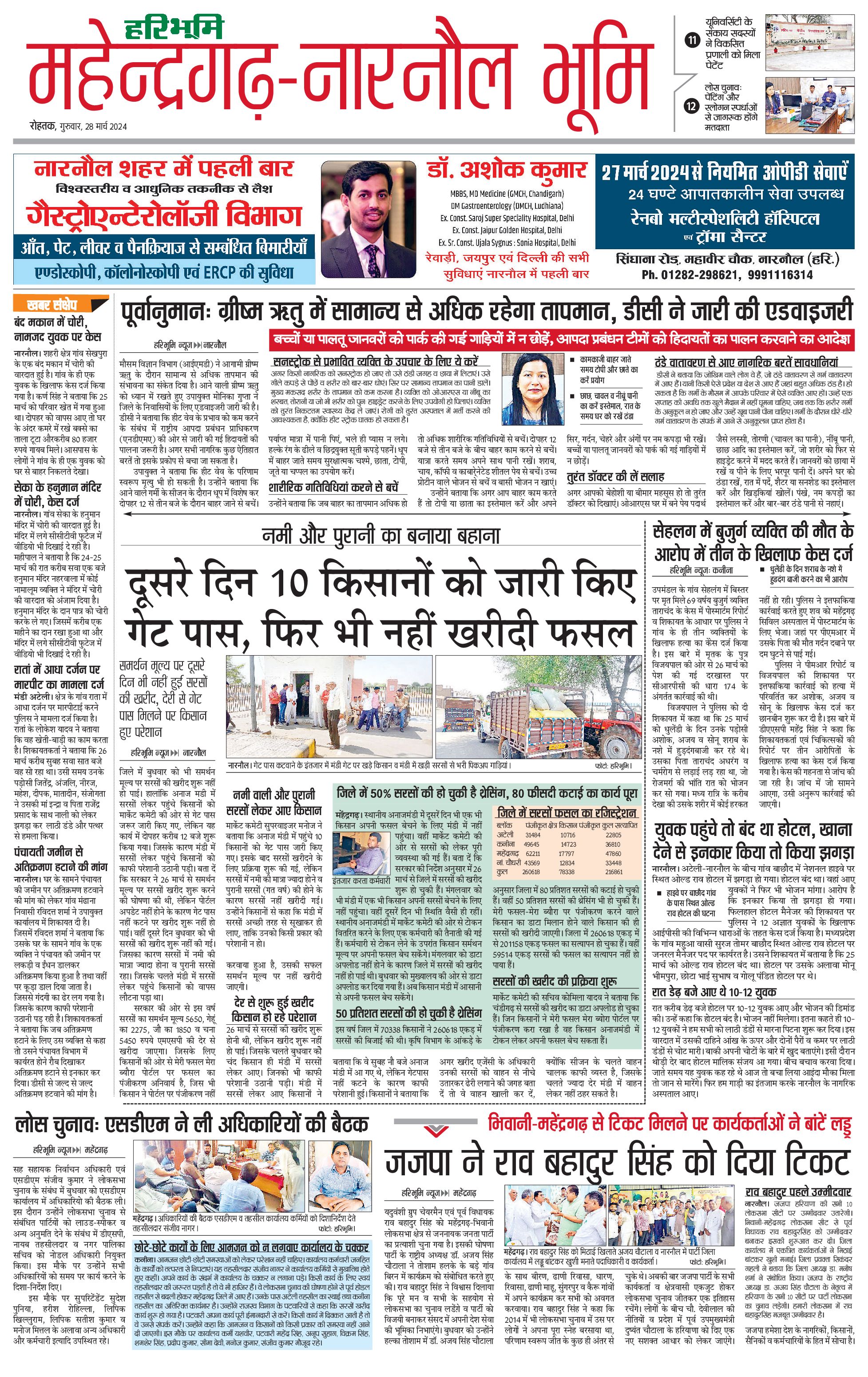 महेंद्रगढ़ - 28 Mar 2024 - - Page 1
