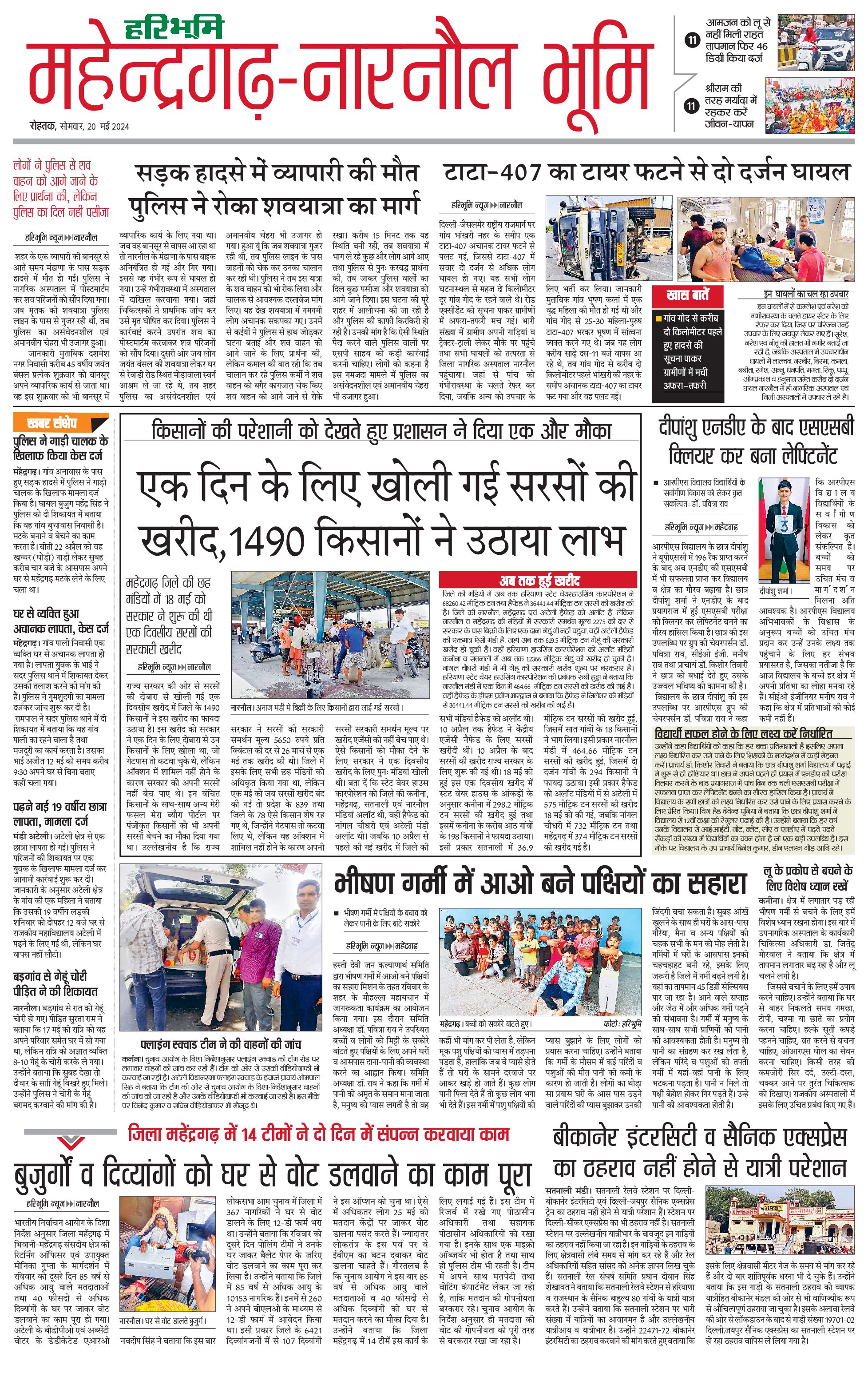 महेंद्रगढ़ - 20 May 2024 - - Page 1