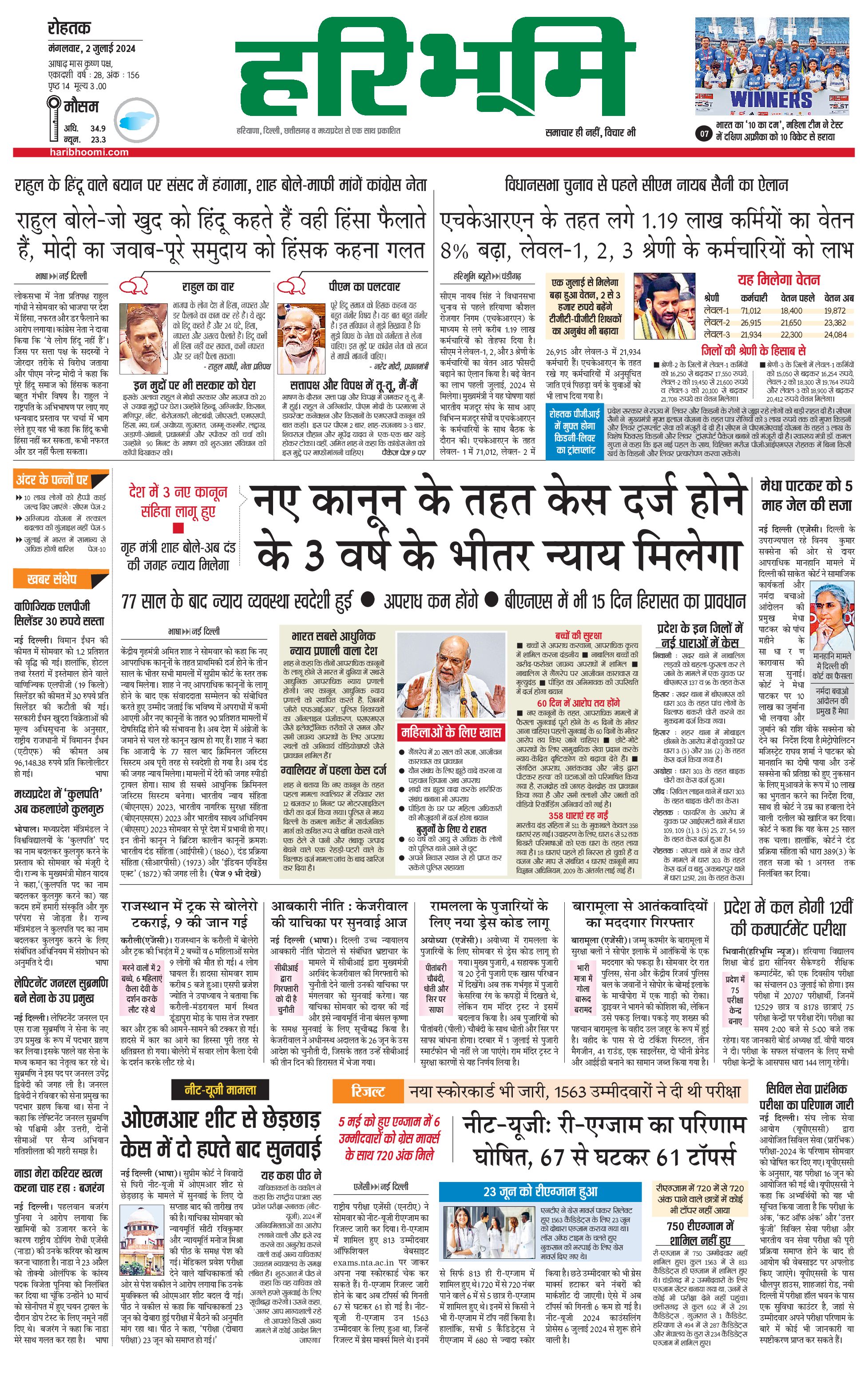 रोहतक मुख्य संस्करण - 02 Jul 2024 - - Page 1