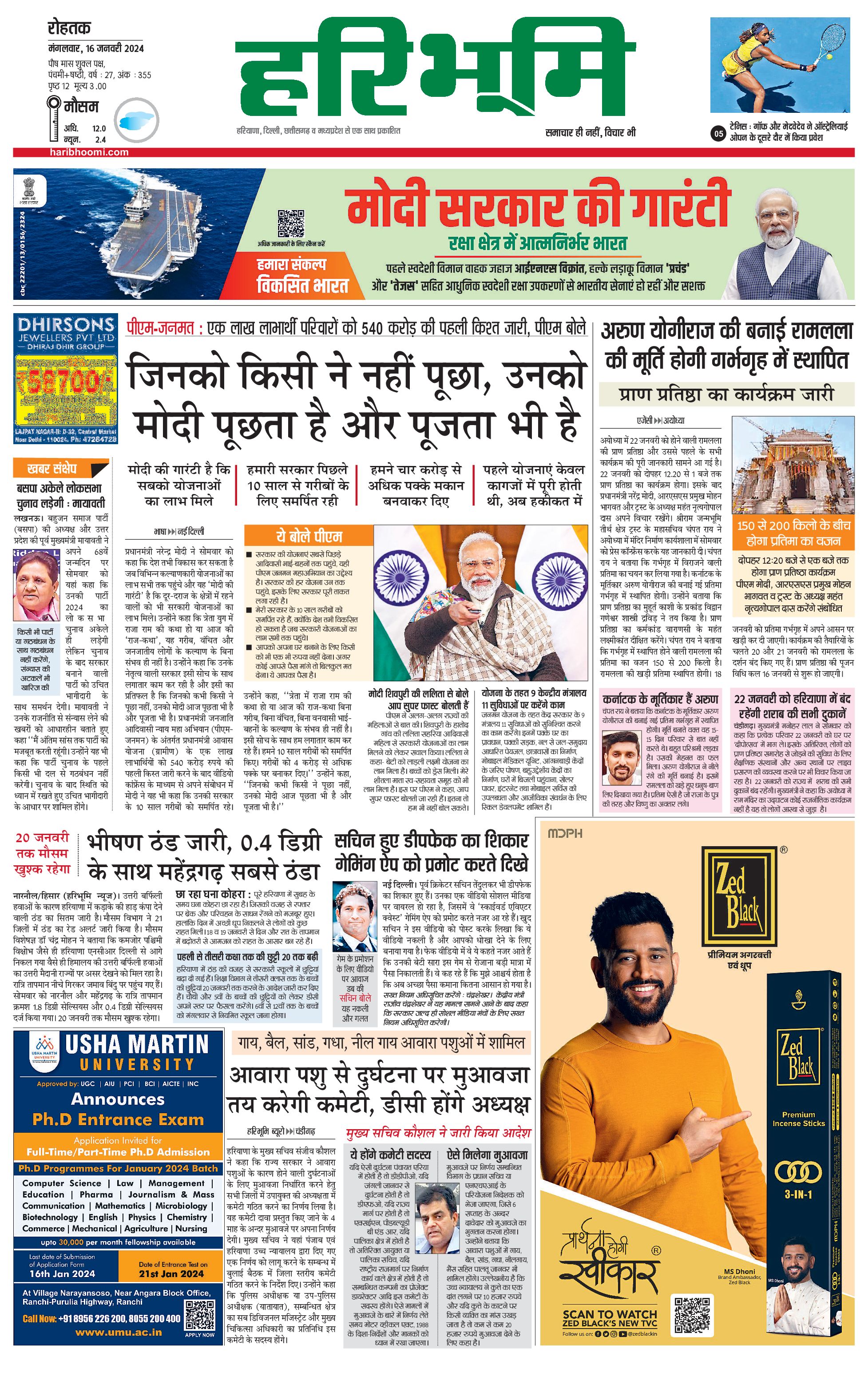 रोहतक मुख्य संस्करण - 16 Jan 2024 - - Page 1