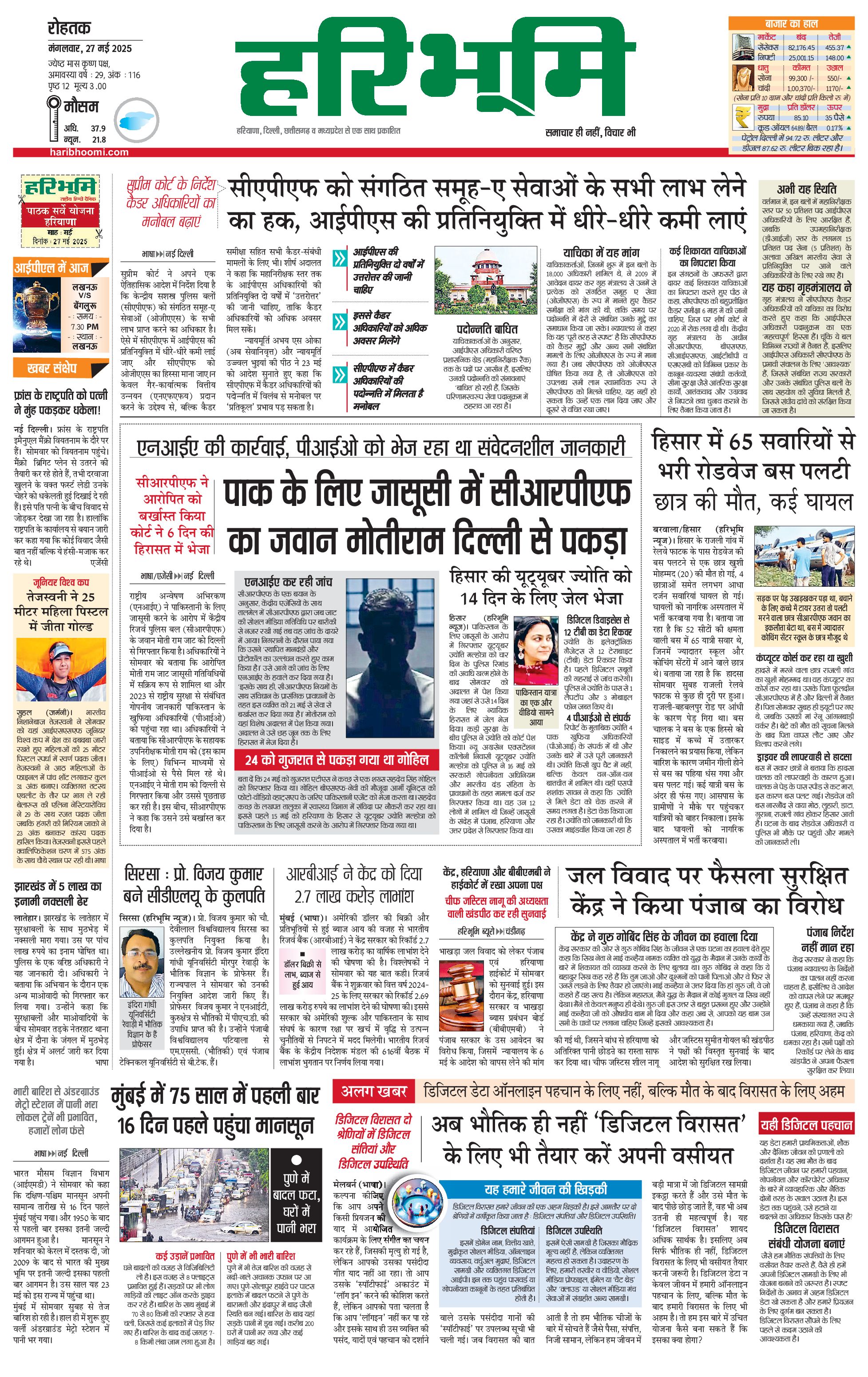 रोहतक मुख्य संस्करण - 27 May 2025 - - Page 1