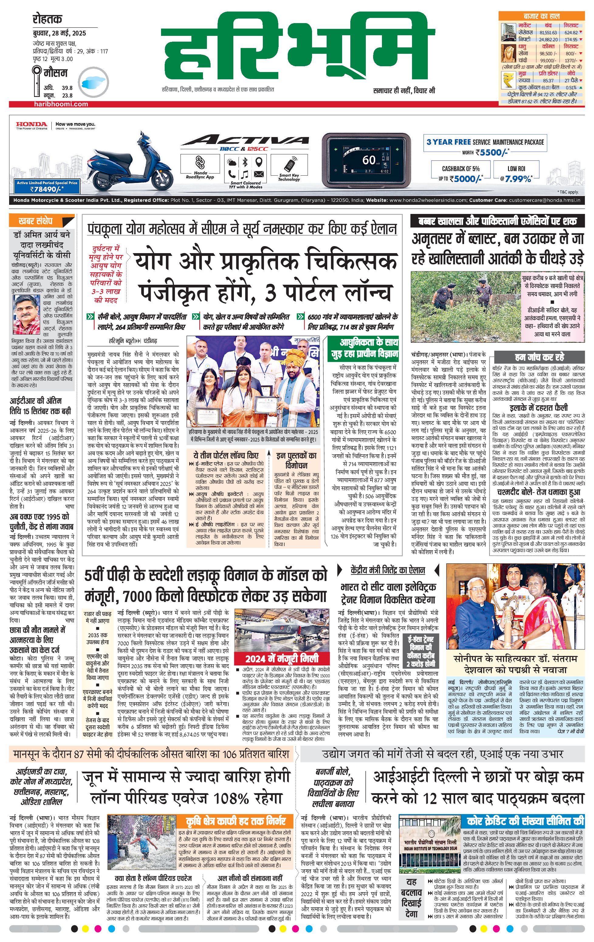 रोहतक मुख्य संस्करण - 28 May 2025 - - Page 1