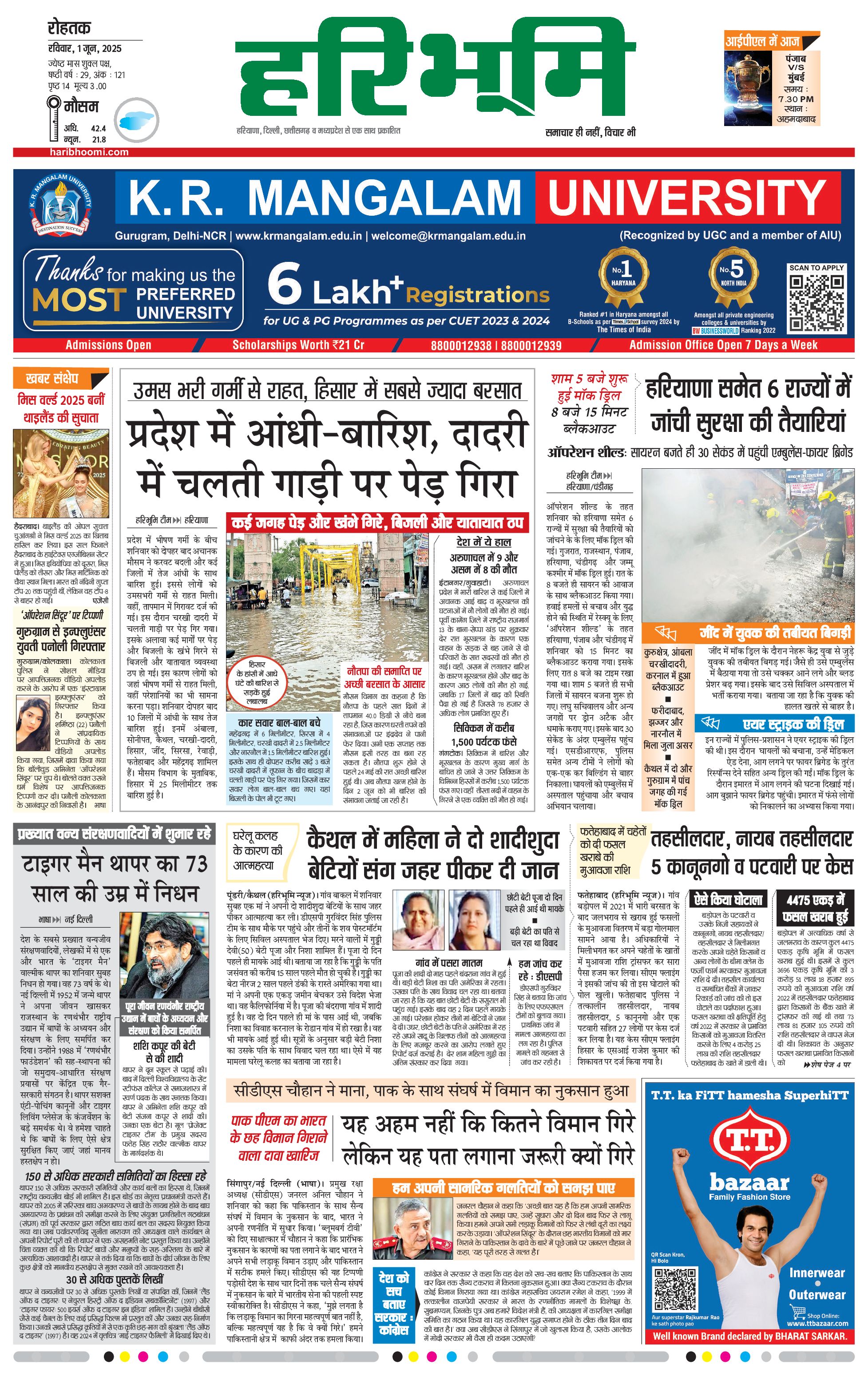रोहतक मुख्य संस्करण - 01 Jun 2025 - - Page 1