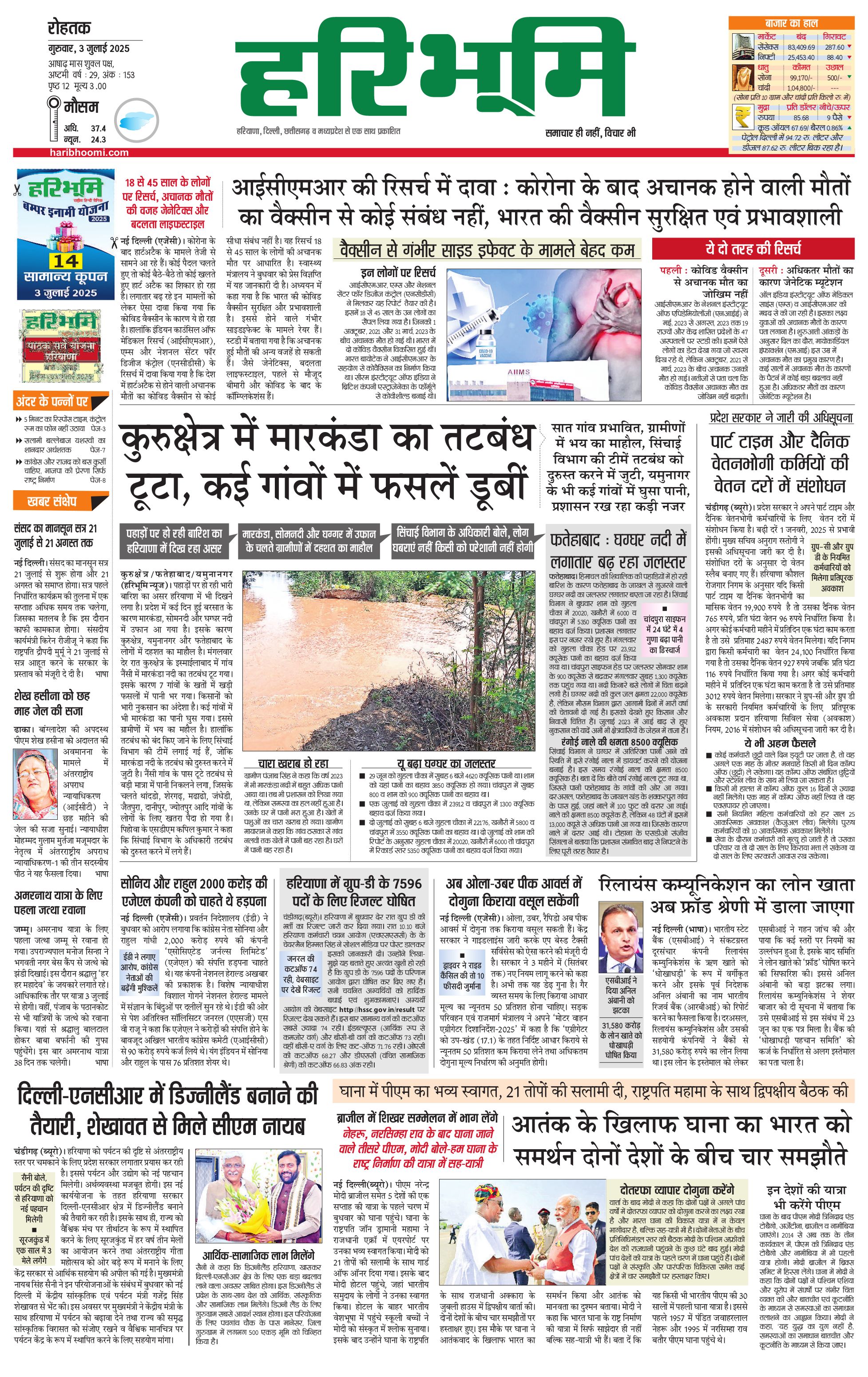 रोहतक मुख्य संस्करण - 03 Jul 2025 - - Page 1