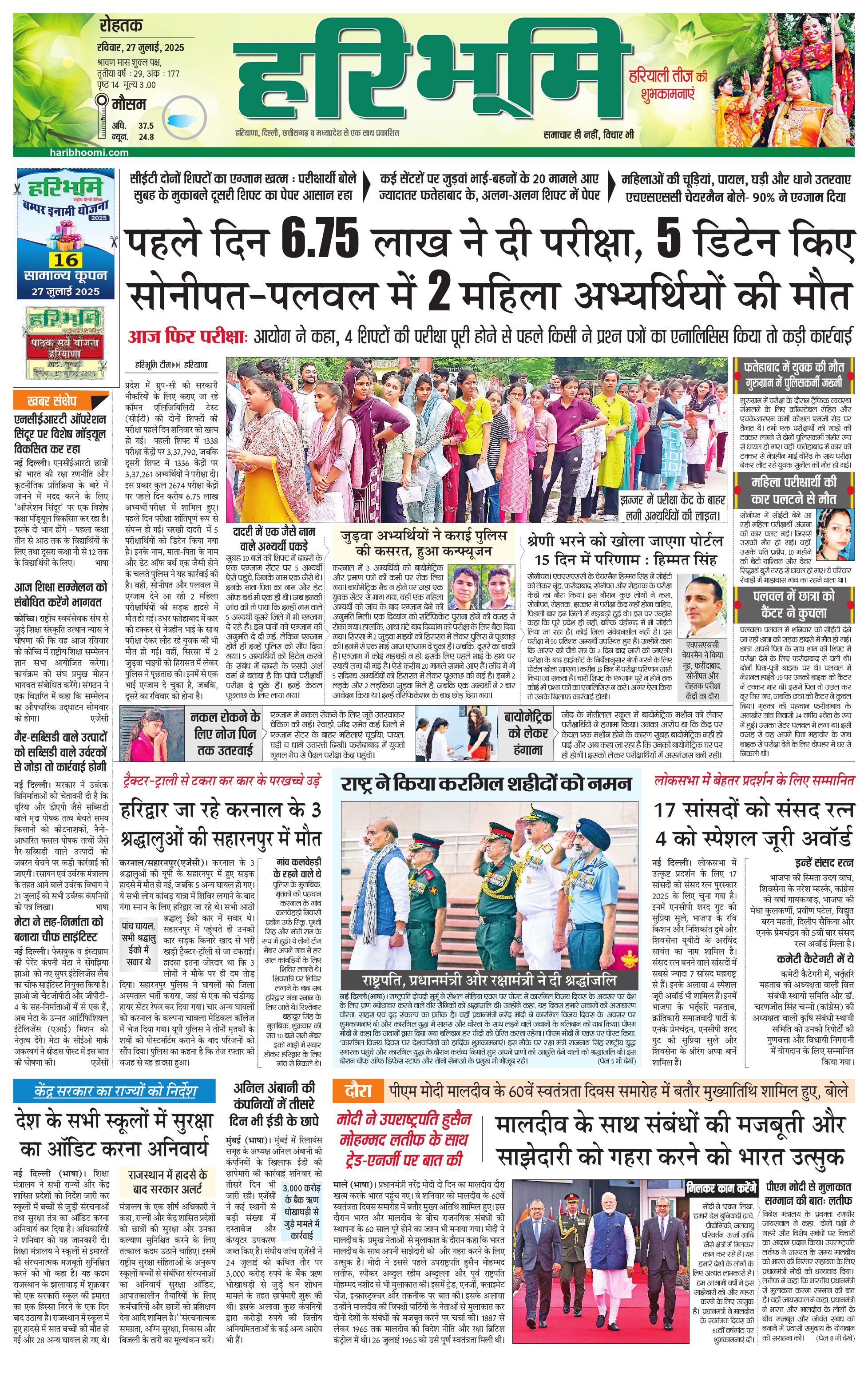रोहतक मुख्य संस्करण - 27 Jul 2025 - - Page 1