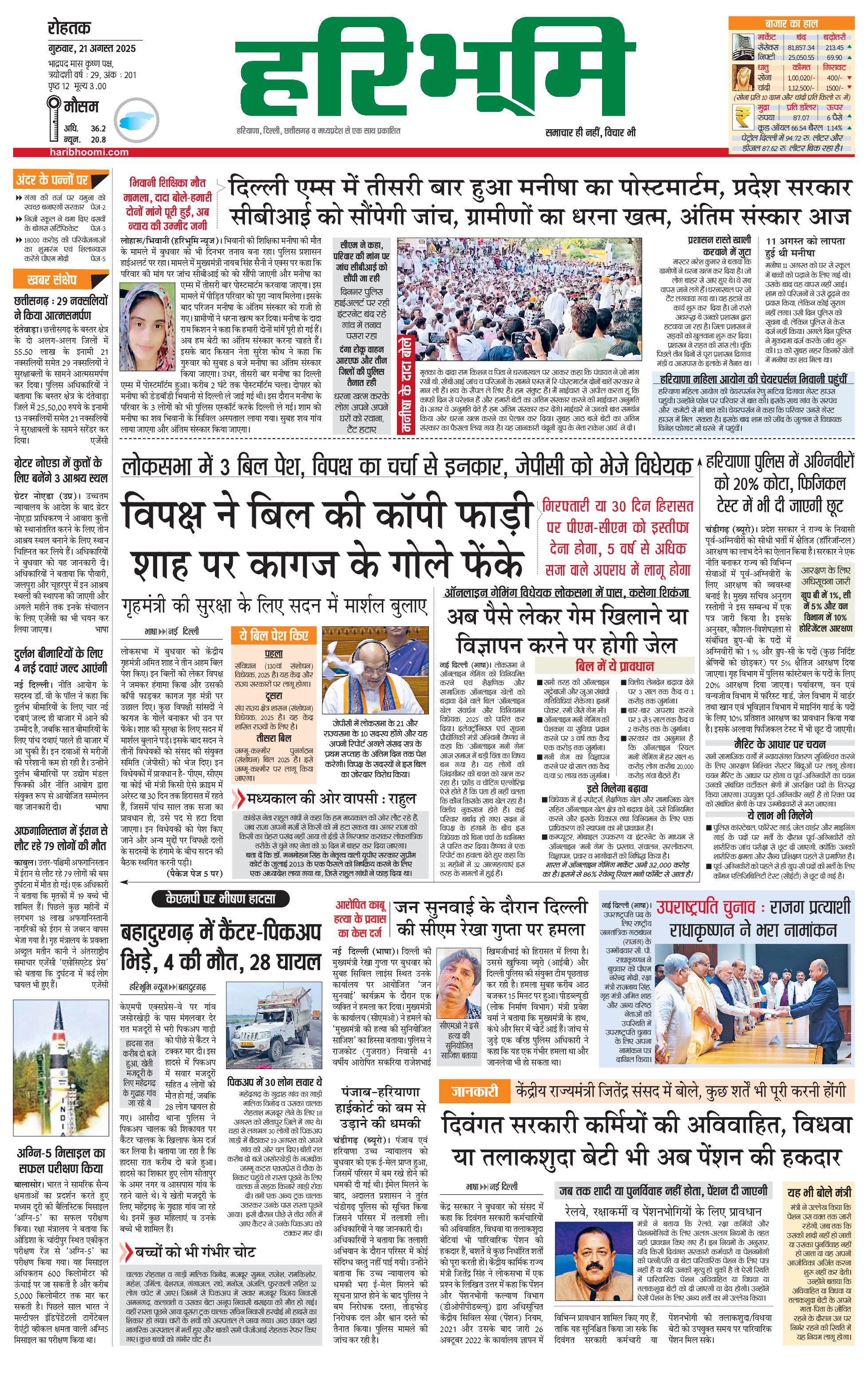 रोहतक मुख्य संस्करण - 21 Aug 2025 - - Page 1
