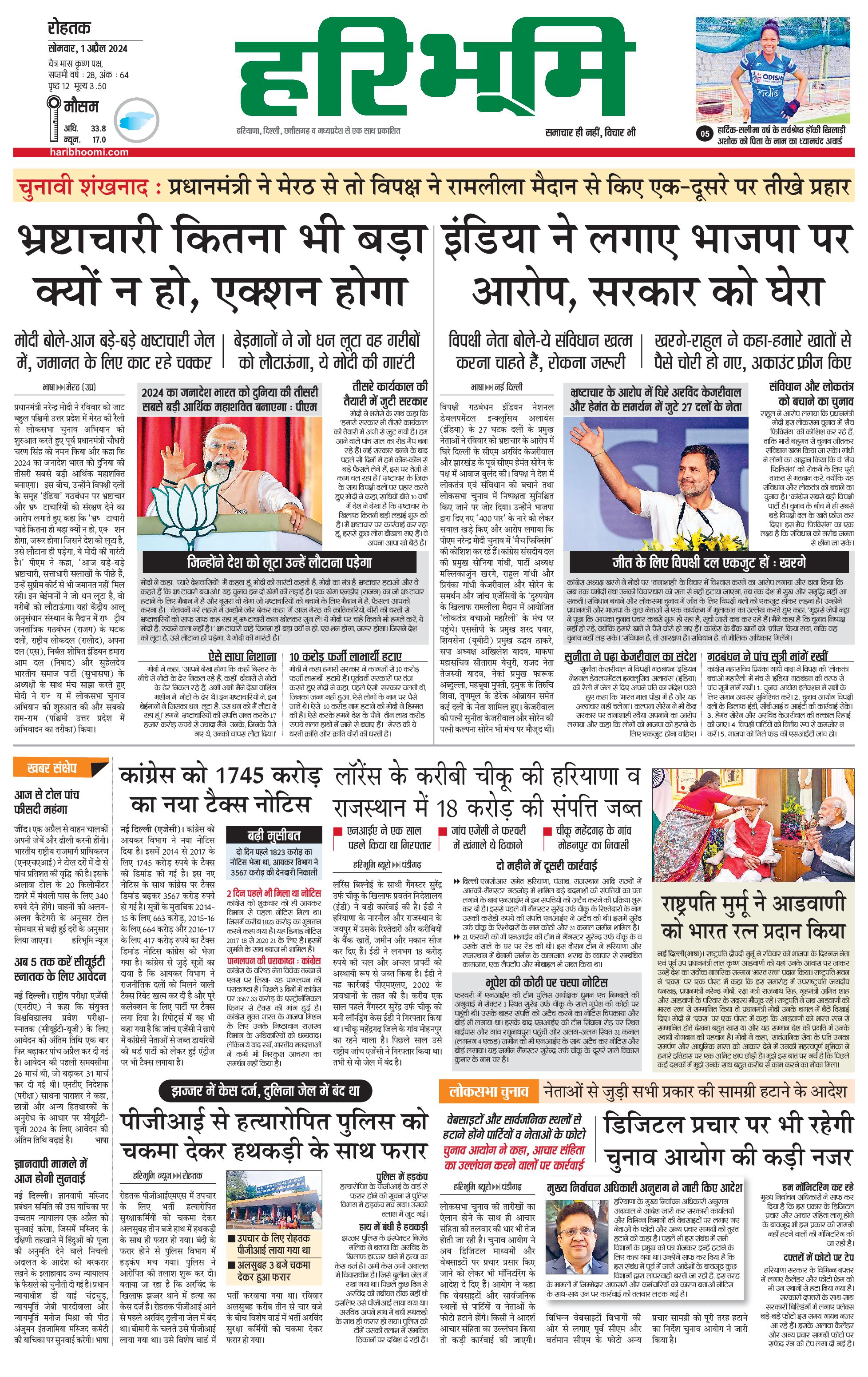 रोहतक मुख्य संस्करण - 01 Apr 2024 - - Page 1
