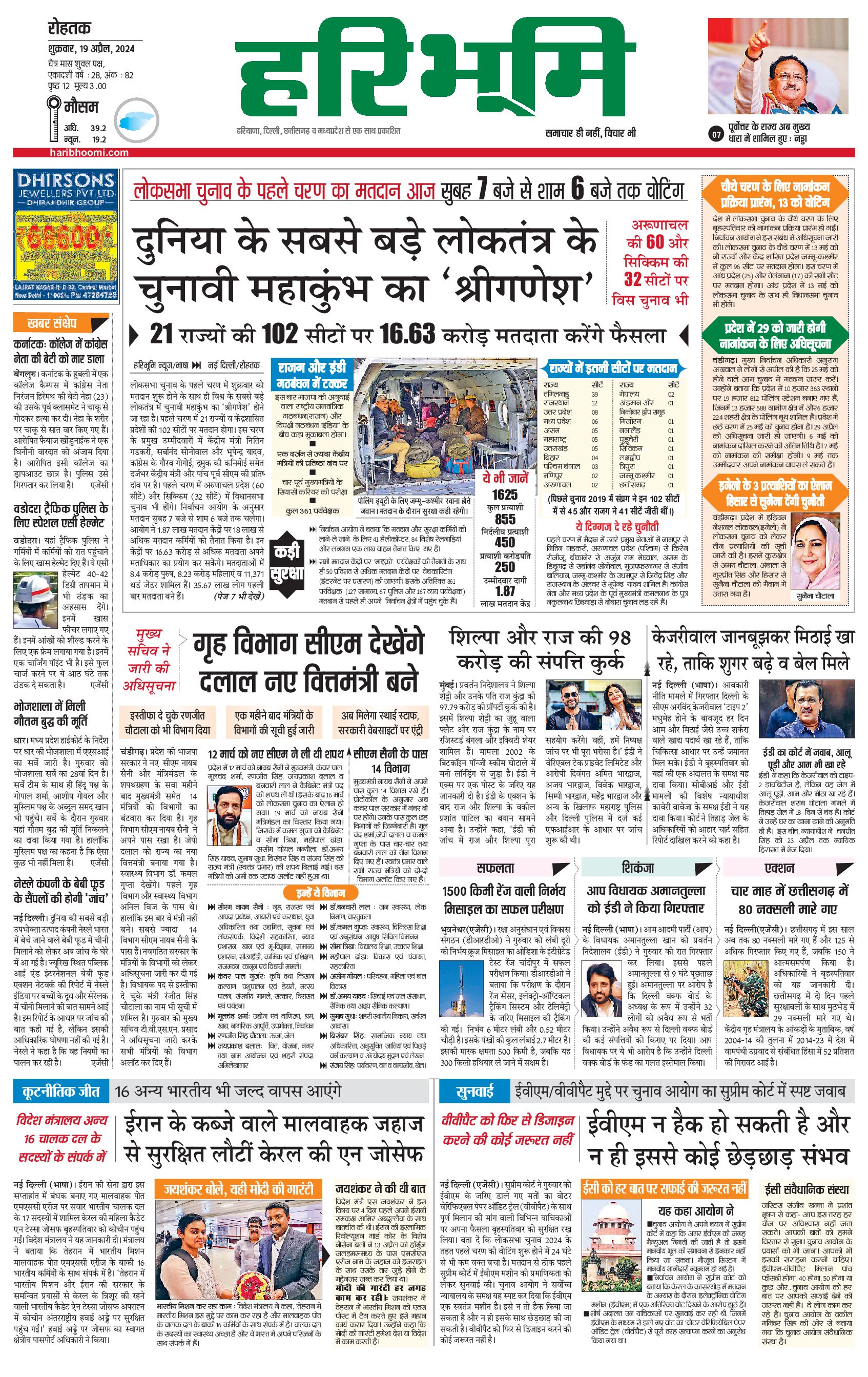 रोहतक मुख्य संस्करण - 19 Apr 2024 - - Page 1
