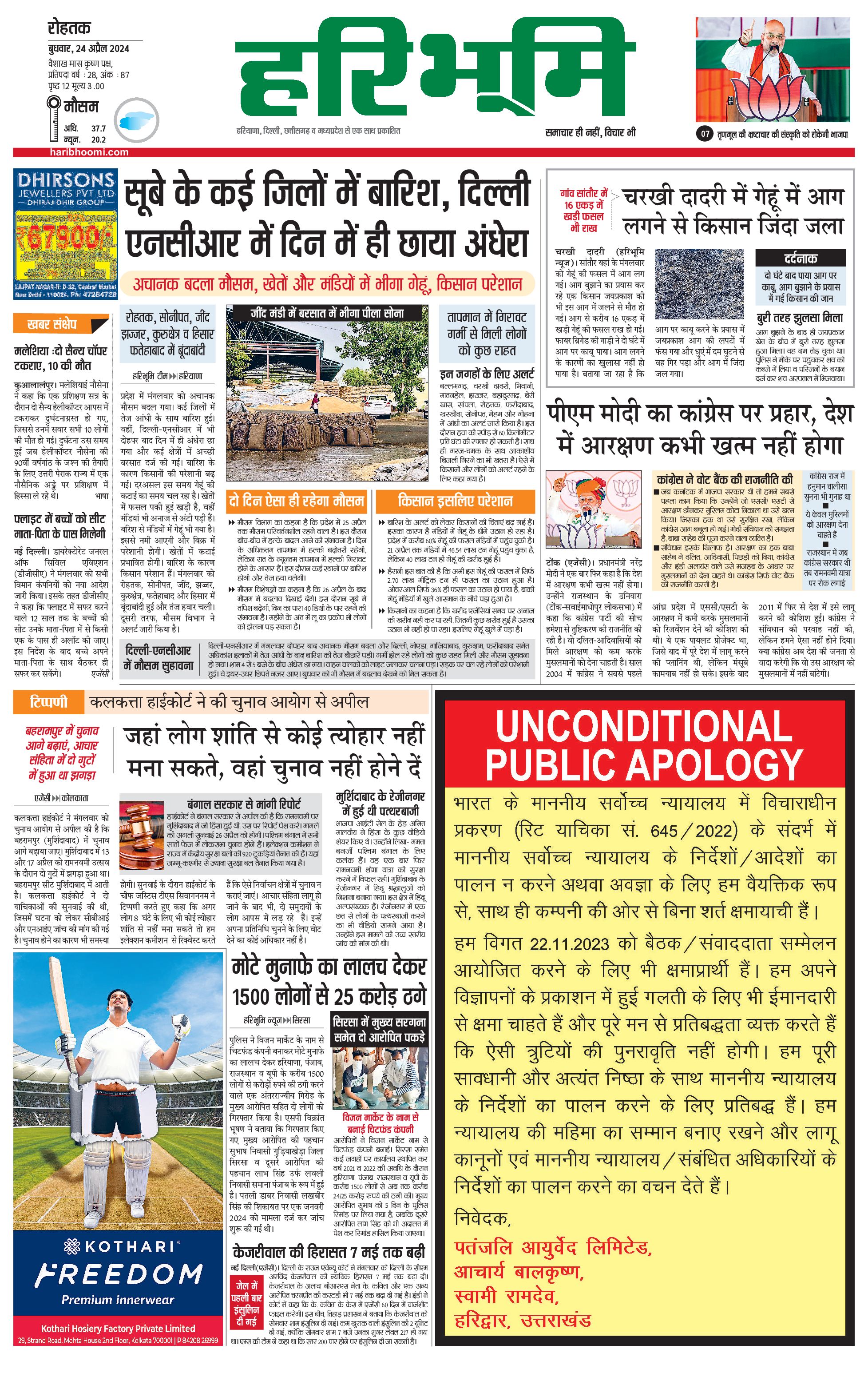 रोहतक मुख्य संस्करण - 24 Apr 2024 - - Page 1