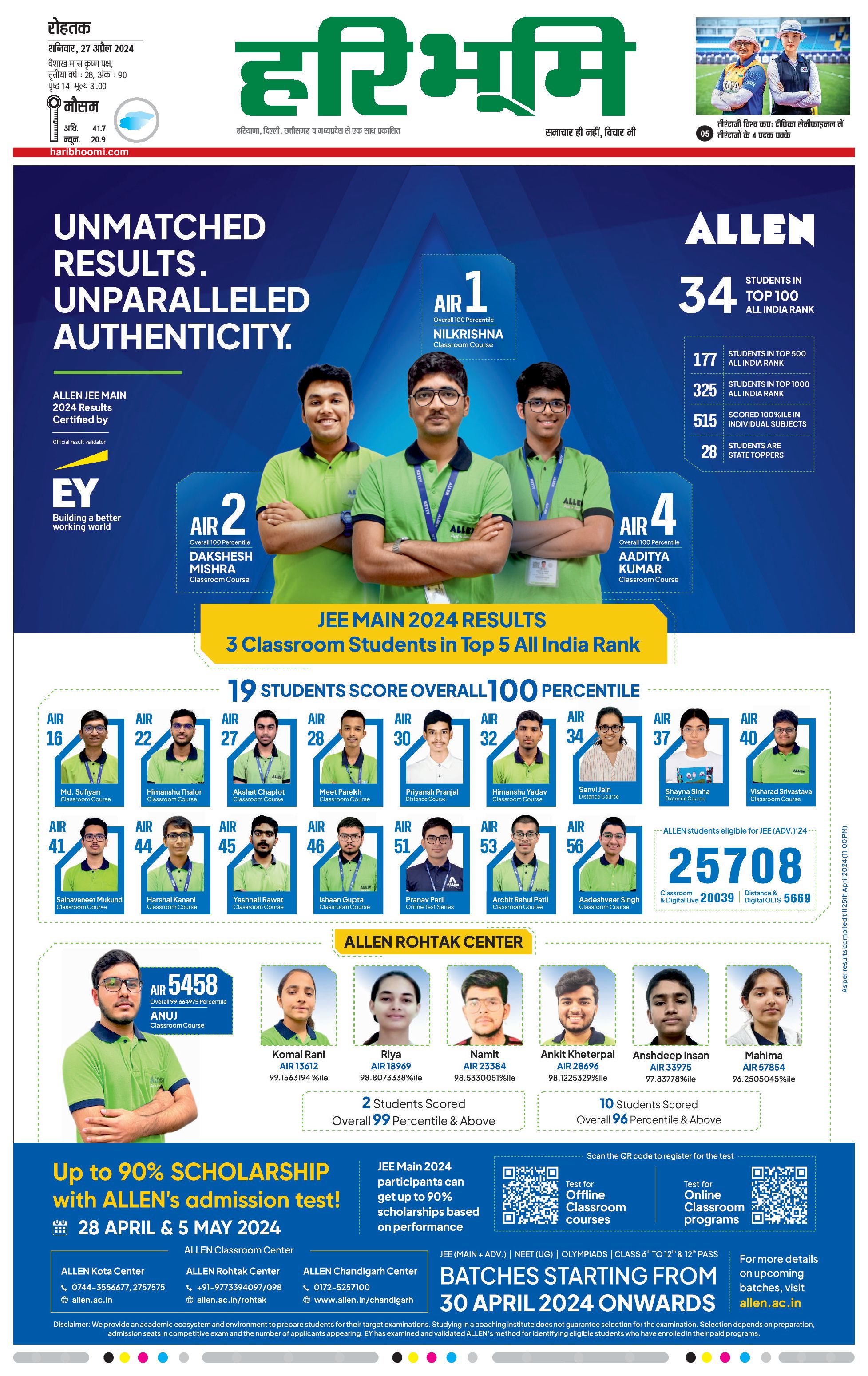 रोहतक मुख्य संस्करण - 27 Apr 2024 - - Page 1