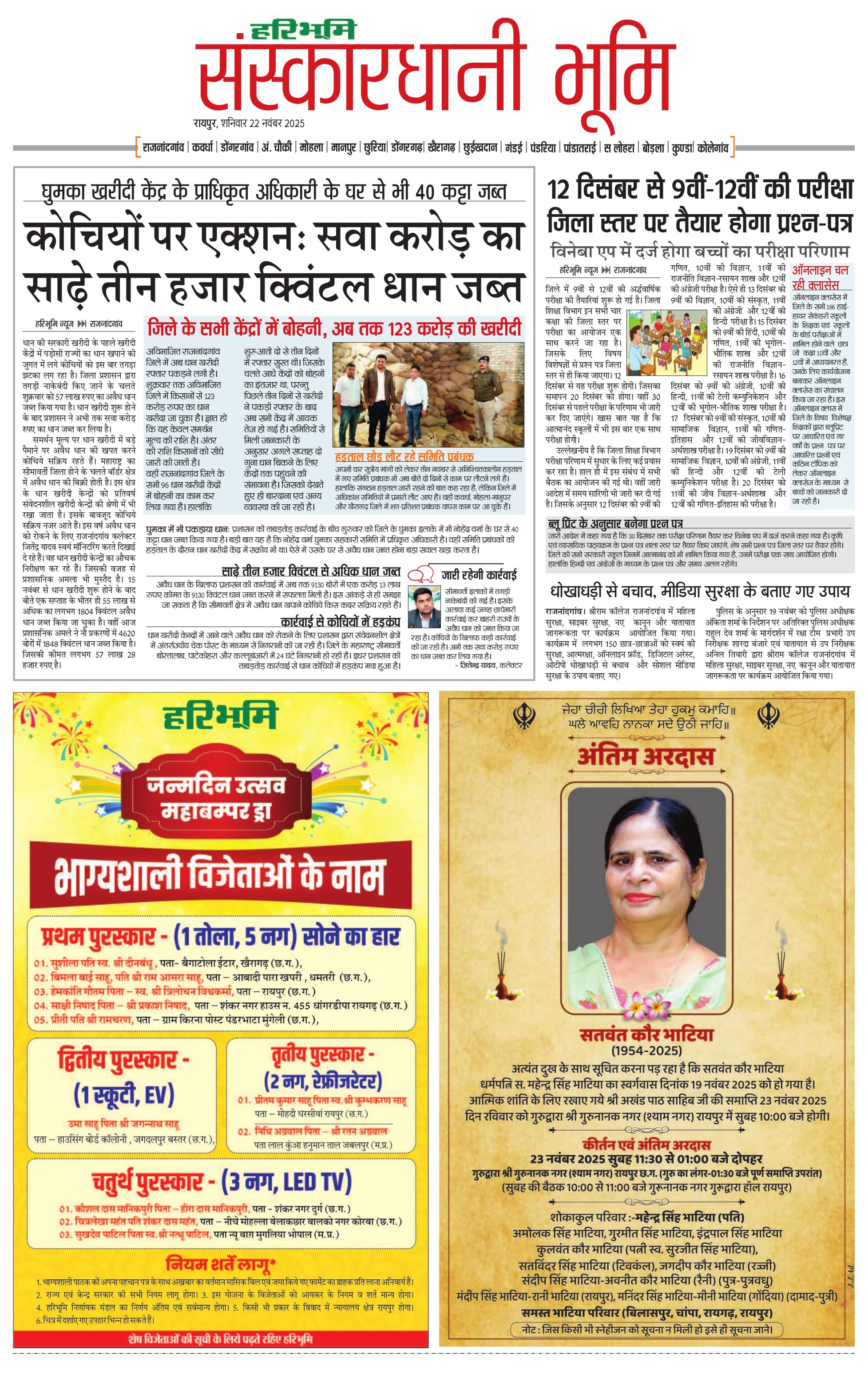 संस्कारधानी भूमि - 22 Nov 2025 - - Page 1